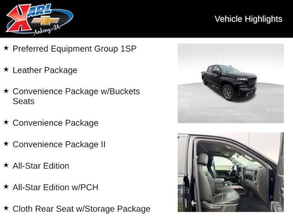 At Karl Chevrolet, we want to help you find the best new or used car in Ankeny that suits your needs. When you buy a new car at Karl Chevrolet, you know you're finding a vehicle you can rely on. We have a great selection of Platinum Quality Pre-Owned Vehicles. We also pride ourselves in creating a friendly atmosphere and a reliable Dealership that you can trust. Call us and our experts will be glad to help you! (515) 299-4300. *Equipment and options are generated by a 3rd party vendor, exact vehicle options may vary. Please see a salesperson for complete details and vehicle information.
