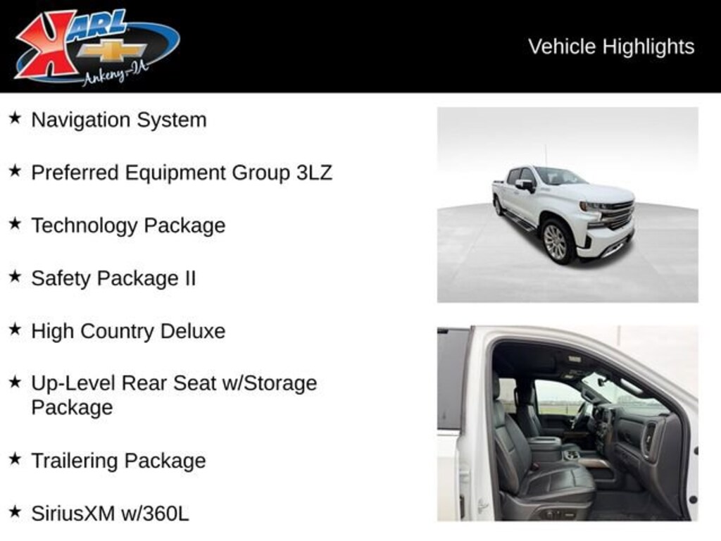 Recent Arrival! CARFAX One Owner & Local Trade! Clean CARFAX. Certified. Iridescent Pearl Tricoat 2021 Chevrolet Silverado 1500 High Country 4WD CREW CAB 147 EcoTec3 5.3L V8 10-Speed Automatic, 4WD, Jet Black Leather, 15 Diagonal Multicolor Head-Up Display, 4G LTE Wi-Fi Hot Spot Capable, Adaptive Cruise Control, Advanced Trailering System, All-Weather Floor Liner (LPO), Apple CarPlay/Android Auto, Auto-Dimming Inside Rear-View Mirror, Auto-Locking Rear Differential, Automatic Emergency Braking, Auxiliary External Transmission Oil Cooler, Bed View Camera, Bluetooth® For Phone, Chevrolet Connected Access Capable, Chevytec Spray-On Black Bedliner, Chrome Assist Steps, Chrome Grille, Chrome Recovery Hooks, Color-Keyed Carpeting Floor Covering, Compass, Deep-Tinted Glass, Driver Memory, Dual Exhaust w/Polished Outlets, Electric Rear-Window Defogger, Electrical Lock Control Steering Column, Electronic Cruise Control, Floor Mounted Center Console, Following Distance Indicator, Forward Collision Alert, Front Carpeted Floor Mats, Front dual zone A/C, Front LED Fog Lamps, Front Pedestrian Braking, Fully automatic headlights, HD Rear Vision Camera, HD Surround Vision w/2 Trailer View Camera Provisions, Heated Driver & Front Outboard Passenger Seats, Heated Steering Wheel, High Country Deluxe, Hitch Guidance w/Hitch View, Integrated Trailer Brake Controller, IntelliBeam Automatic High Beam On/Off, Keyless Open & Start, Lane Change Alert w/Side Blind Zone Alert, Lane Keep Assist w/Lane Departure Warning, Leather Wrapped Steering Wheel, LED Cargo Area Lighting, Manual Tilt/Telescoping Steering Column, Navigation System, OnStar & Chevrolet Connected Services Capable, Outside Heated Power-Adjustable Mirrors, Painted Mirror Caps, Power Door Locks, Power driver seat, Power Sliding Rear Window w/Rear Defogger, Power Sunroof, Power Tailgate, Power windows, Preferred Equipment Group 3LZ, Rear Camera Mirror, Rear Carpeted Floor Mats, Rear Cross Traffic Alert, Rear Dual USB Charging-Only Ports, Rear Wheelhouse Liners, Remote Vehicle Starter System, Safety Alert Seat, Safety Package II, SiriusXM w/360L, Standard Tailgate, Steering Wheel Audio Controls, Technology Package, Theft Deterrent System (Unauthorized Entry), Trailering Package, Ultrasonic Front & Rear Park Assist, Universal Home Remote, Up-Level Rear Seat w/Storage Package, Ventilated Driver & Front Passenger Seats, Wheels: 22 x 9 Polished Aluminum, Wireless Charging, Wireless Phone Projection. 16/22 City/Highway MPG 10-Speed Automatic 4WDCertification Program Details: Karl Chevrolet of Ankeny, The Nation's #1 CarBravo certified dealer, where platinum quality vehicles and unmatched benefits come together! This vehicle qualifies for our CarBravo Certified program reserved for the highest-quality pre-owned vehicles that are 10 model years or newer and have less than 100,000 miles. Every CarBravo Certified vehicle includes: ? Comprehensive 126-Point Inspection Professionally inspected by factory-trained technicians to meet strict mechanical, safety, and cosmetic standards. ? 6-Month / 6,000-Mile Bumper-to-Bumper Limited Warranty Enjoy added peace of mind with extensive coverage from the day you drive off the lot. ? 24/7 Roadside Assistance & Courtesy Transportation Flat tire? Dead battery? Need a tow? You're covered anywhere, anytime throughout the warranty period. ? Vehicle History & Title Guarantee Clean title, completed safety recalls, and a full CARFAX® or AutoCheck® report provided for complete transparency. ? 10-Day / 500-Mile Exchange Promise If you don't absolutely love it, bring it back and exchange it no hassle, no stress. Experience peace of mind and premium protection exclusively from Karl Chevrolet of Ankeny, the Nation's #1 CarBravo Certified Deale
