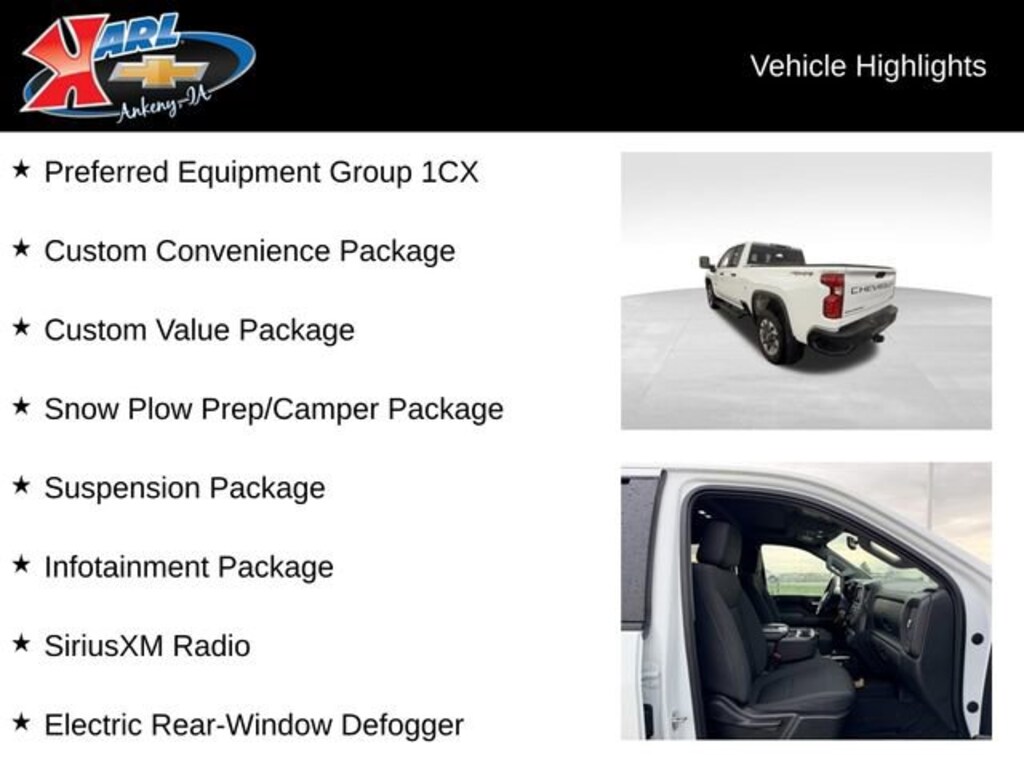 Certification Program Details: Karl Chevrolet of Ankeny, The Nation's #1 CarBravo Certified Dealer! Every CarBravo Certified vehicle includes: Comprehensive 126-Point Inspection Professionally inspected by factory-trained technicians to meet strict mechanical, safety, and cosmetic standards. 12-Month / 12,000-Mile Bumper-to-Bumper Limited Warranty Enjoy added peace of mind with extensive coverage from the day you drive off the lot. 24/7 Roadside Assistance & Courtesy Transportation Flat tire? Dead battery? Need a tow? You're covered anywhere, anytime throughout the warranty period. Vehicle History & Title Guarantee Clean title, completed safety recalls, and a full CARFAX® or AutoCheck® report provided for complete transparency. 10-Day / 500-Mile Exchange Promise If you don't absolutely love it, bring it back and exchange it no hassle, no stress. Experience peace of mind and premium protection exclusively from Karl Chevrolet of Ankeny, the Nation's #1 CarBravo Dealer!This 2021 Chevrolet Silverado 2500HD Custom 4WD DOUBLE CAB 149 is packed with an impressive array of features that make it a standout choice for those seeking power, capability, and convenience. Equipped with a robust 6.6L V8 engine and 4-wheel drive, this truck is ready to tackle any terrain or towing task with confidence. The CHEVYTEC SPRAY-ON BEDLINER, Auxiliary Battery, and Snow Plow Prep/Camper Package further enhance its utility, while the Custom Convenience Package, Infotainment Package, and Suspension Package provide premium comfort and technology.- CHEVYTEC SPRAY-ON BEDLINER- Auxiliary Battery- Snow Plow Prep/Camper Package- Custom Convenience Package- Infotainment Package- Suspension Package- SiriusXM Radio- Bluetooth® For Phone- Remote Vehicle Starter System- Integrated Trailer Brake Controller- Wheels: 20 10-Spoke Machined AluminumThis Silverado 2500HD has been meticulously inspected and certified through our exclusive CarBravo program, ensuring that it meets the highest standards of quality and performance. With a comprehensive 126-point inspection, a 12-month/12,000-mile bumper-to-bumper warranty, and 24/7 roadside assistance, you can drive with confidence knowing that this vehicle has been thoroughly vetted and is ready to provide you with years of reliable service.Whether you're looking for a capable work truck or a versatile family hauler, this 2021 Chevrolet Silverado 2500HD Custom 4WD DOUBLE CAB 149 is an exceptional choice. Its powerful engine, advanced features, and premium protection make it a truly compelling option in the full-size truck segment.At Karl Chevrolet we want to help you find the best new or used car in Ankeny that suits your needs. When you buy a new car at Karl Chevrolet you know you're finding a vehicle you can rely on. We have a great selection of Platinum Quality Pre-Owned Vehicles. We also pride ourselves in creating a friendly atmosphere and a reliable Dealership that you can trust. Call us and our experts will be glad to help you! (515) 299-4300. *Equipment and options are generated by a 3rd party vendor, exact vehicle options may vary. Please see a salesperson for complete details and vehicle information.