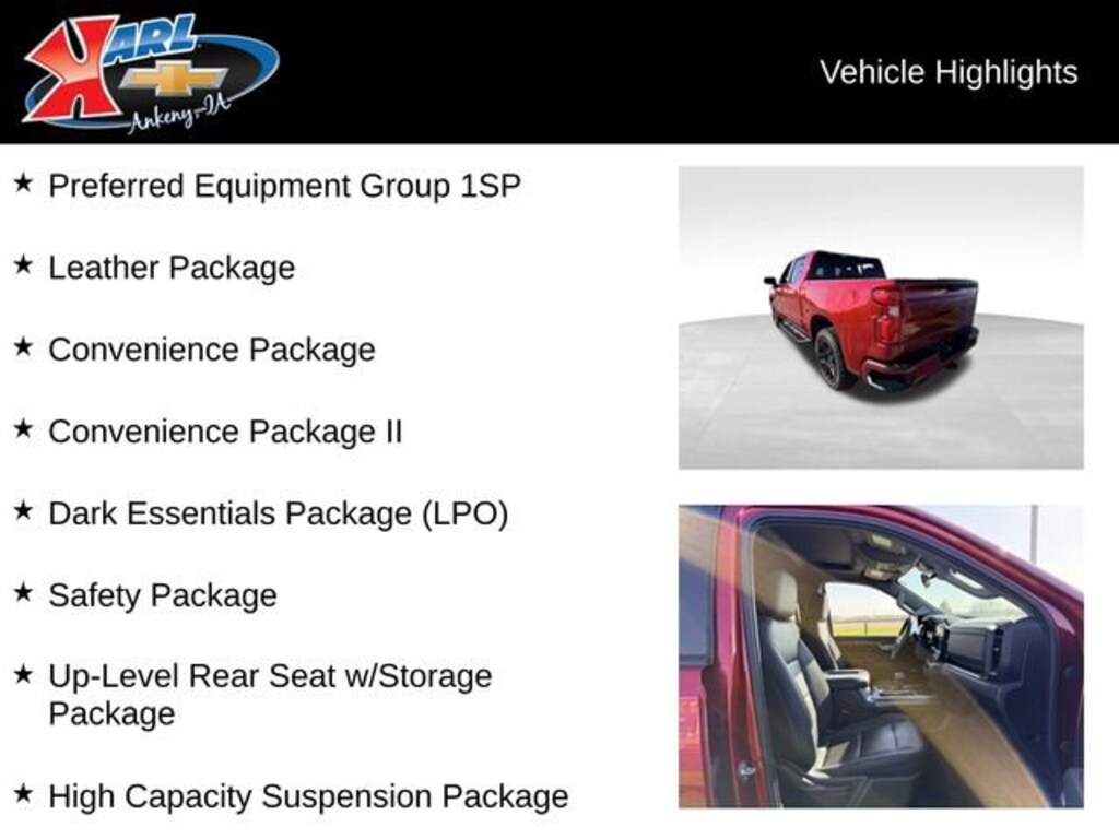 Certification Program Details: Karl Chevrolet of Ankeny, The Nation's #1 CarBravo Certified Dealer! Every CarBravo Certified vehicle includes: Comprehensive 126-Point Inspection Professionally inspected by factory-trained technicians to meet strict mechanical, safety, and cosmetic standards. 12-Month / 12,000-Mile Bumper-to-Bumper Limited Warranty Enjoy added peace of mind with extensive coverage from the day you drive off the lot. 24/7 Roadside Assistance & Courtesy Transportation Flat tire? Dead battery? Need a tow? You're covered anywhere, anytime throughout the warranty period. Vehicle History & Title Guarantee Clean title, completed safety recalls, and a full CARFAX® or AutoCheck® report provided for complete transparency. 10-Day / 500-Mile Exchange Promise If you don't absolutely love it, bring it back and exchange it no hassle, no stress. Experience peace of mind and premium protection exclusively from Karl Chevrolet of Ankeny, the Nation's #1 CarBravo Dealer!- Leather Package- Convenience Package II- Dark Essentials Package (LPO)- Z71 Off-Road Package- Trailering Package- Premium Bose 7-Speaker Sound System- Wireless Phone Projection- Dual-Zone Automatic Climate Control- 120-Volt Bed Mounted Power Outlet- Remote Vehicle Starter SystemThis 2022 Chevrolet Silverado 1500 RST 4WD CREW 147 is a standout in its class, combining rugged capability, advanced technology, and premium comfort features. Powered by the reliable EcoTec3 5.3L V8 engine and equipped with 4-wheel drive, this Silverado is ready to tackle any terrain with confidence. The sleek Red exterior pairs perfectly with the stylish High Gloss Black painted 20-inch aluminum wheels, giving this truck a bold, commanding presence.Inside, you'll find a wealth of premium amenities, including the Leather Package, Convenience Package II, and Z71 Off-Road Package. Enjoy the premium Bose 7-speaker sound system, wireless phone projection, and dual-zone automatic climate control for a truly luxurious driving experience. The 120-volt power outlet in the bed allows you to power your tools or equipment on the job site, while the remote vehicle starter system provides the ultimate in convenience.This Silverado has been meticulously inspected and certified by our team of factory-trained technicians to meet the highest standards of quality and safety. With a comprehensive 126-point inspection, a 12-month/12,000-mile bumper-to-bumper limited warranty, and 24/7 roadside assistance, you can drive with confidence knowing that your investment is protected.At Karl Chevrolet, we are committed to providing our customers with the best possible buying experience. Our friendly and knowledgeable sales team is here to answer any questions you may have and help you find the perfect vehicle to fit your needs. Call us today at (515) 299-4300 to schedule a test drive and experience the difference that Karl Chevrolet can make.At Karl Chevrolet we want to help you find the best new or used car in Ankeny that suits your needs. When you buy a new car at Karl Chevrolet you know you're finding a vehicle you can rely on. We have a great selection of Platinum Quality Pre-Owned Vehicles. We also pride ourselves in creating a friendly atmosphere and a reliable Dealership that you can trust. Call us and our experts will be glad to help you! (515) 299-4300. *Equipment and options are generated by a 3rd party vendor, exact vehicle options may vary. Please see a salesperson for complete details and vehicle information.