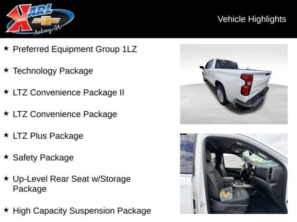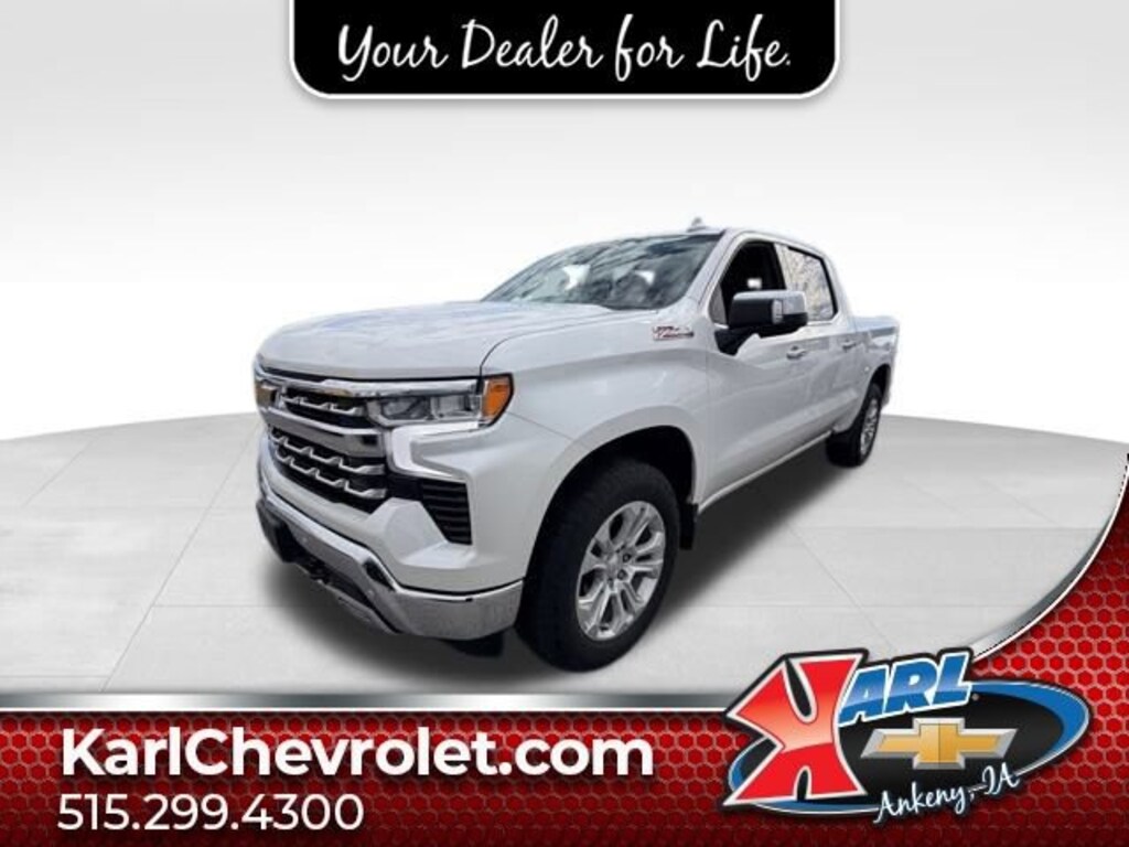 Recent Arrival! CARFAX One-Owner, Local Trade, Sold New at Karls & All Services Done at Karls! Certified. Iridescent Pearl Tricoat 2023 Chevrolet Silverado 1500 LTZ 4WD CREW CAB 147 LTZ EcoTec3 5.3L V8 10-Speed Automatic, 4WD, Jet Black Leather, 12.3 Multicolor Reconfigurable Digital Display, 15 Diagonal Multicolor Head-Up Display, 2 USB Data Ports, 2nd Row Heated Outboard Seats, Adaptive Cruise Control, Apple CarPlay/Android Auto, Auto High-beam Headlights, Auto-Dimming Inside Rear-View Mirror, Auto-Locking Rear Differential, Bed View Camera, Bluetooth® For Phone, Chevrolet Connected Access Capable, Chevytec Spray-On Black Bedliner, Chrome Mirror Caps, Color-Keyed Carpeting Floor Covering, Compass, Deep-Tinted Glass, Driver Memory, Dual Exhaust w/Polished Outlets, Dual Rear USB Ports (Charge Only), Electric Rear-Window Defogger, Electronic Cruise Control, Floor Mounted Center Console, Forward Collision Alert, Front dual zone A/C, Front Frame-Mounted Black Recovery Hooks, Front LED Fog Lamps, Front Rainsensing Wipers, Front Rubberized Vinyl Floor Mats, HD Surround Vision, Heated Driver & Front Outboard Passenger Seats, Heated Steering Wheel, Heavy-Duty Air Filter, High Capacity Suspension Package, Hill Descent Control, Hitch Guidance w/Hitch View, Integrated Trailer Brake Controller, Keyless Open & Start, Lane Keep Assist w/Lane Departure Warning, LED Cargo Area Lighting, LTZ Convenience Package, LTZ Convenience Package II, LTZ Plus Package, Off-Road Suspension, OnStar & Chevrolet Connected Services Capable, Outside Heated Power-Adjustable Mirrors, Perimeter Lighting, Power driver seat, Power Sliding Rear Window w/Rear Defogger, Power Tailgate, Power Tilt & Telescoping Steering Column, Power windows, Preferred Equipment Group 1LZ, Premium Bose 7-Speaker Sound System, Rain sensing wipers, Rear Camera Mirror, Rear Cross Traffic Alert-Braking, Rear Pedestrian Alert, Rear Rubberized-Vinyl Floor Mats, Rear Wheelhouse Liners, Remote Vehicle Starter System, Safety Alert Seat, Safety Package, SiriusXM w/360L, Standard Tailgate, Steering Wheel Audio Controls, Technology Package, Theft Deterrent System (Unauthorized Entry), Trailer Camera Provisions, Trailer Side Blind Zone Alert, Trailering App, Trailering Package, Ultrasonic Front & Rear Park Assist, Universal Home Remote, Up-Level Rear Seat w/Storage Package, Ventilated Driver & Front Passenger Seats, Wheels: 20 x 9 Sterling Silver Painted Aluminum, Wi-Fi Hot Spot Capable, Wireless Charging, Wireless Phone Projection, Wrapped Steering Wheel, Z71 Off-Road Package. 16/20 City/Highway MPG 10-Speed Automatic 4WD