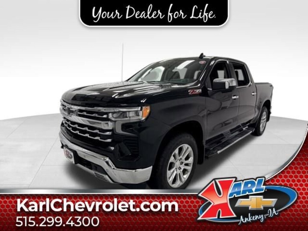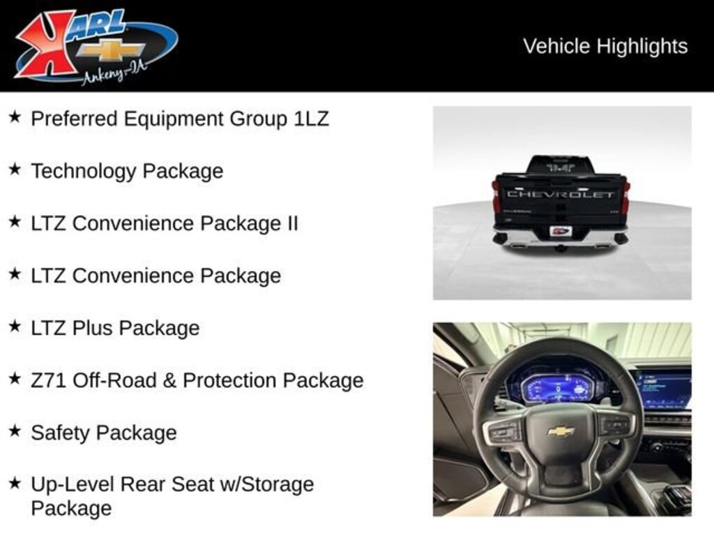 Recent Arrival! Clean CARFAX. Local Trade & Sold New at Karls! Equipped With Running Boards, Mud Flaps & Tonneau COver! Certified. Black 2023 Chevrolet Silverado 1500 LTZ 4WD CREW 147 3.0L I6 10-Speed Automatic, 4WD, Jet Black Leather, 12.3 Multicolor Reconfigurable Digital Display, 15 Diagonal Multicolor Head-Up Display, 2 USB Data Ports, 2nd Row Heated Outboard Seats, Adaptive Cruise Control, All-Weather Floor Liner (LPO) (AAK), Apple CarPlay/Android Auto, Auto High-beam Headlights, Auto-Dimming Inside Rear-View Mirror, Auto-Locking Rear Differential, Bed View Camera, Bluetooth® For Phone, Chevrolet Connected Access Capable, Chevytec Spray-On Black Bedliner, Chrome Mirror Caps, Color-Keyed Carpeting Floor Covering, Compass, Deep-Tinted Glass, Driver Memory, Dual Exhaust w/Polished Outlets, Dual Rear USB Ports (Charge Only), Electric Rear-Window Defogger, Electronic Cruise Control, Floor Mounted Center Console, Forward Collision Alert, Front dual zone A/C, Front Frame-Mounted Black Recovery Hooks, Front LED Fog Lamps, Front Rainsensing Wipers, Front Rubberized Vinyl Floor Mats, HD Surround Vision, Heated Driver & Front Outboard Passenger Seats, Heated Steering Wheel, Heavy-Duty Air Filter, High Capacity Suspension Package, Hill Descent Control, Hitch Guidance, Hitch Guidance w/Hitch View, Integrated Trailer Brake Controller, Keyless Open & Start, Lane Keep Assist w/Lane Departure Warning, LED Cargo Area Lighting, LTZ Convenience Package, LTZ Convenience Package II, LTZ Plus Package, Off-Road Suspension, OnStar & Chevrolet Connected Services Capable, Outside Heated Power-Adjustable Mirrors, Perimeter Lighting, Power driver seat, Power Sliding Rear Window w/Rear Defogger, Power Tailgate, Power Tilt & Telescoping Steering Column, Preferred Equipment Group 1LZ, Premium Bose 7-Speaker Sound System, Rear Camera Mirror, Rear Cross Traffic Alert-Braking, Rear Pedestrian Alert, Rear Rubberized-Vinyl Floor Mats, Rear Wheelhouse Liners, Remote Vehicle Starter System, Safety Alert Seat, Safety Package, SiriusXM w/360L, Standard Tailgate, Steering Wheel Audio Controls, Technology Package, Theft Deterrent System (Unauthorized Entry), Trailer Camera Provisions, Trailer Side Blind Zone Alert, Trailering App, Trailering Package, Ultrasonic Front & Rear Park Assist, Universal Home Remote, Up-Level Rear Seat w/Storage Package, Ventilated Driver & Front Passenger Seats, Wheels: 20 x 9 Sterling Silver Painted Aluminum, Wi-Fi Hot Spot Capable, Wireless Charging, Wireless Phone Projection, Wrapped Steering Wheel, Z71 Off-Road & Protection Package, Z71 Off-Road Package. 22/27 City/Highway MPG 10-Speed Automatic 4WDCertification Program Details: Karl Chevrolet of Ankeny, The Nation's #1 CarBravo certified dealer, where platinum quality vehicles and unmatched benefits come together! This vehicle qualifies for our CarBravo Certified program reserved for the highest-quality pre-owned vehicles that are 10 model years or newer and have less than 100,000 miles. Every CarBravo Certified vehicle includes: ? Comprehensive 126-Point Inspection Professionally inspected by factory-trained technicians to meet strict mechanical, safety, and cosmetic standards. ? 6-Month / 6,000-Mile Bumper-to-Bumper Limited Warranty Enjoy added peace of mind with extensive coverage from the day you drive off the lot. ? 24/7 Roadside Assistance & Courtesy Transportation Flat tire? Dead battery? Need a tow? You're covered anywhere, anytime throughout the warranty period. ? Vehicle History & Title Guarantee Clean title, completed safety recalls, and a full CARFAX® or AutoCheck® report provided for complete transparency. ? 10-Day / 500-Mile Exchange Promise If you don't absolutely love it, bring it back and exchange it no hassle, no stress. Experience peace of mind and premium protection exclusively from Karl Chevrolet of Ankeny, the Nation's #1 CarBravo Certified Deale