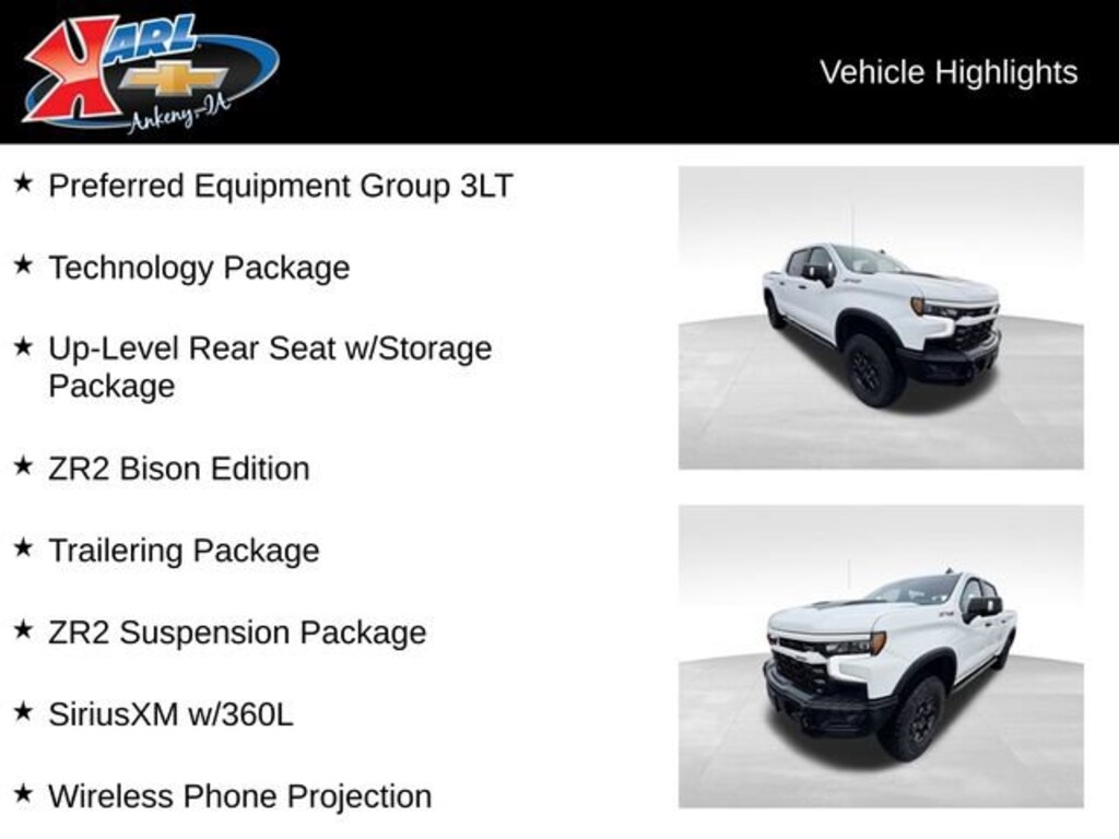 Recent Arrival! CARFAX One-Owner, Local Trade & Sold New at Karls! Equipped With Running Boards & Tonneau Cover! Clean CARFAX. Certified. Summit White 2023 Chevrolet Silverado 1500 ZR2 4WD CREW CAB 147 ZR2 EcoTec3 6.2L V8 10-Speed Automatic, 4WD, Jet Black/Graystone Leather, 12.3 Multicolor Reconfigurable Digital Display, 15 Diagonal Multicolor Head-Up Display, 170 Amp Alternator, 2 USB Data Ports, 2nd Row Heated Outboard Seats, Adaptive Cruise Control, AEV Front Bumper, AEV Fuel Tank Skid Plate, AEV Rear Bumper, Apple CarPlay/Android Auto, Auto High-beam Headlights, Auto-Dimming Inside Rear-View Mirror, Auto-Locking Rear Differential, Bed View Camera, Bluetooth® For Phone, Chevytec Spray-On Black Bedliner, Deep-Tinted Glass, Driver Memory, Dual Exhaust, Dual Rear USB Ports (Charge Only), Electric Rear-Window Defogger, Electronic Cruise Control, EZ Lift Power Lock & Release Tailgate, Floor Mounted Center Console, Forward Collision Alert, Front dual zone A/C, Front LED Fog Lamps, Front Rainsensing Wipers, HD Surround Vision, Heated Driver & Front Outboard Passenger Seats, Heated Steering Wheel, Heavy-Duty Air Filter, High Gloss Black Mirror Caps, Hill Descent Control, Hitch Guidance w/Hitch View, Integrated Trailer Brake Controller, Keyless Open & Start, Lane Keep Assist w/Lane Departure Warning, LED Cargo Area Lighting, Manual Tilt/Telescoping Steering Column, Multi-Flex Tailgate, OnStar & Chevrolet Connected Services Capable, Outside Heated Power-Adjustable Mirrors, Performance Red Recovery Hooks, Perimeter Lighting, Power driver seat, Power Sliding Rear Window w/Rear Defogger, Power Tilt & Telescoping Steering Column, Power windows, Preferred Equipment Group 3LT, Premium Bose 7-Speaker Sound System, Rain sensing wipers, Rear Camera Mirror, Rear Cross Traffic Alert-Braking, Rear Park Assist, Rear Parking Sensors, Rear Pedestrian Alert, Rear Wheelhouse Liners, Remote Vehicle Starter System, Rocker Protector (LPO), Safety Alert Seat, SiriusXM w/360L, Standard Tailgate, Steering Wheel Audio Controls, Technology Package, Theft Deterrent System (Unauthorized Entry), Trailer Camera Provisions, Trailer Side Blind Zone Alert, Trailering App, Trailering Package, Universal Home Remote, Up-Level Rear Seat w/Storage Package, Ventilated Driver & Front Passenger Seats, Wheels: 18 x 8.5 Aluminum AEV, Wi-Fi Hot Spot Capable, Wireless Charging, Wireless Phone Projection, Wrapped Steering Wheel, ZR2 Bison Edition, ZR2 Suspension Package. 14/17 City/Highway MPG 10-Speed Automatic 4WD