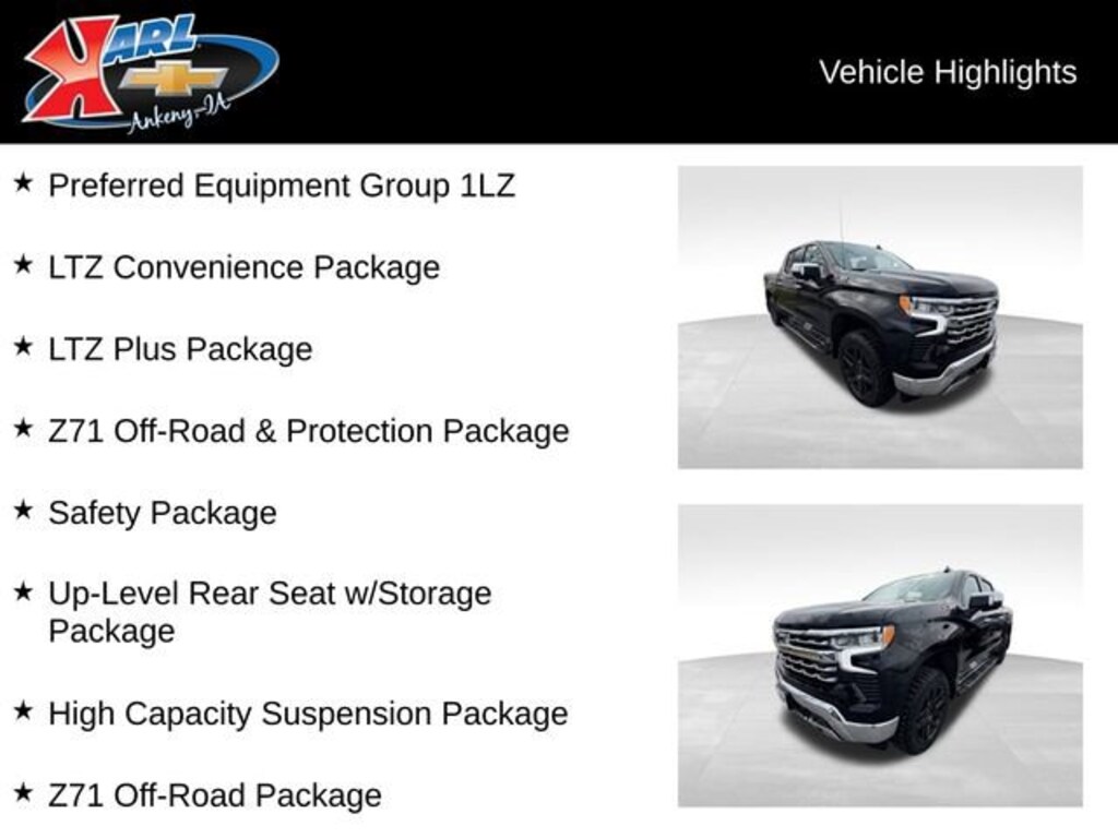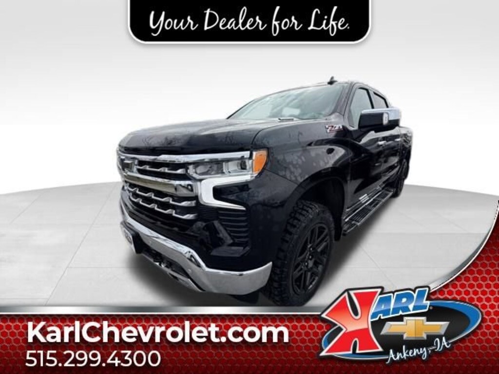 Recent Arrival! CARFAX One-Owner, Local Trade & Sold New at Karls! Equipped With Running Boards & Mud Flaps! Clean CARFAX. Certified. Black 2023 Chevrolet Silverado 1500 LTZ 4WD CREW CAB 147 LT 3.0L I6 10-Speed Automatic, 4WD, Gideon/Very Dark Atmosphere Leather, 12.3 Multicolor Reconfigurable Digital Display, 2 USB Data Ports, All-Weather Floor Liner (LPO) (AAK), Apple CarPlay/Android Auto, Auto High-beam Headlights, Auto-Dimming Inside Rear-View Mirror, Auto-Locking Rear Differential, Bluetooth® For Phone, Chevrolet Connected Access Capable, Chevytec Spray-On Black Bedliner, Chrome Mirror Caps, Color-Keyed Carpeting Floor Covering, Compass, Deep-Tinted Glass, Driver Memory, Dual Exhaust w/Polished Outlets, Dual Rear USB Ports (Charge Only), Electric Rear-Window Defogger, Electronic Cruise Control, Floor Mounted Center Console, Forward Collision Alert, Front dual zone A/C, Front Frame-Mounted Black Recovery Hooks, Front LED Fog Lamps, Front Rainsensing Wipers, Front Rubberized Vinyl Floor Mats, HD Surround Vision, Heated Driver & Front Outboard Passenger Seats, Heated Steering Wheel, Heavy-Duty Air Filter, High Capacity Suspension Package, Hill Descent Control, Hitch Guidance w/Hitch View, Integrated Trailer Brake Controller, Keyless Open & Start, Lane Keep Assist w/Lane Departure Warning, LED Cargo Area Lighting, LTZ Convenience Package, LTZ Plus Package, Off-Road Suspension, OnStar & Chevrolet Connected Services Capable, Outside Heated Power-Adjustable Mirrors, Perimeter Lighting, Power driver seat, Power Tailgate, Power Tilt & Telescoping Steering Column, Power windows, Preferred Equipment Group 1LZ, Premium Bose 7-Speaker Sound System, Rear Cross Traffic Alert-Braking, Rear Pedestrian Alert, Rear Rubberized-Vinyl Floor Mats, Rear Wheelhouse Liners, Remote Vehicle Starter System, Safety Alert Seat, Safety Package, SiriusXM w/360L, Standard Tailgate, Steering Wheel Audio Controls, Theft Deterrent System (Unauthorized Entry), Trailer Camera Provisions, Trailer Side Blind Zone Alert, Trailering App, Trailering Package, Ultrasonic Front & Rear Park Assist, Up-Level Rear Seat w/Storage Package, Ventilated Driver & Front Passenger Seats, Wheels: 20 x 9 Sterling Silver Painted Aluminum, Wi-Fi Hot Spot Capable, Wireless Charging, Wireless Phone Projection, Wrapped Steering Wheel, Z71 Off-Road & Protection Package, Z71 Off-Road Package. 22/27 City/Highway MPG 10-Speed Automatic 4WD