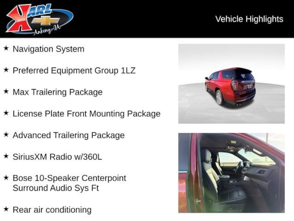 This Certified Pre-Owned Tahoe has been meticulously inspected and comes with a comprehensive warranty, giving you the peace of mind you deserve. Experience the pinnacle of full-size SUV luxury and capability visit Karl Chevrolet of Ankeny today and take this exceptional Tahoe for a test drive.