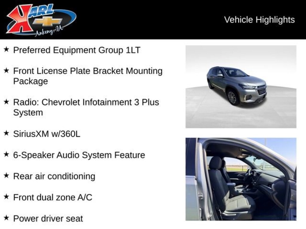 Certification Program Details: Karl Chevrolet of Ankeny, The Nation's #1 CarBravo Certified Dealer! Every CarBravo Certified vehicle includes: Comprehensive 126-Point Inspection Professionally inspected by factory-trained technicians to meet strict mechanical, safety, and cosmetic standards. 12-Month / 12,000-Mile Bumper-to-Bumper Limited Warranty Enjoy added peace of mind with extensive coverage from the day you drive off the lot. 24/7 Roadside Assistance & Courtesy Transportation Flat tire? Dead battery? Need a tow? You're covered anywhere, anytime throughout the warranty period. Vehicle History & Title Guarantee Clean title, completed safety recalls, and a full CARFAX® or AutoCheck® report provided for complete transparency. 10-Day / 500-Mile Exchange Promise If you don't absolutely love it, bring it back and exchange it no hassle, no stress. Experience peace of mind and premium protection exclusively from Karl Chevrolet of Ankeny, the Nation's #1 CarBravo Dealer!- License Plate Front Mounting Package- Preferred Equipment Group 1LT- 6-Speaker Audio System Feature- Radio: Chevrolet Infotainment 3 Plus System- SiriusXM w/360L- Front dual zone A/C- Rear air conditioning- Power driver seat- Auto High-beam Headlights- Apple CarPlay/Android Auto- Exterior Parking Camera Rear- 3rd row seats: split-bench- Heated Driver & Front Passenger Seats- Black Roof RailsIntroducing the 2023 Chevrolet Traverse LT AWD, a versatile and well-equipped SUV that's ready to take on your family's adventures. With its spacious interior, advanced technology, and impressive performance, this Traverse is the perfect blend of capability and comfort.Under the hood, you'll find a powerful 3.6L V6 engine paired with a smooth-shifting 9-speed automatic transmission, delivering a confident and efficient driving experience. The all-wheel-drive system ensures optimal traction and control, no matter the road conditions.Inside, the Traverse LT offers seating for up to eight passengers, with a split-bench third-row seat that provides ample room for everyone. The premium cloth upholstery and heated front seats create a comfortable and inviting atmosphere, while the dual-zone automatic climate control keeps everyone at the perfect temperature.The Chevrolet Infotainment 3 Plus system with a large touchscreen display keeps you connected and entertained, with features like Apple CarPlay, Android Auto, and SiriusXM satellite radio. The rearview camera and rear park assist make maneuvering in tight spaces a breeze.This Traverse LT is also equipped with a host of advanced safety features, including automatic high-beam headlights, forward collision alert, and lane keep assist, providing you and your loved ones with added peace of mind on the road.Certified as part of the Karl Chevrolet CarBravo program, this Traverse has undergone a comprehensive 126-point inspection and comes with a 12-month/12,000-mile limited warranty, 24/7 roadside assistance, and a vehicle history and title guarantee. Experience the confidence and protection that only a CarBravo Certified vehicle can offer.At Karl Chevrolet we want to help you find the best new or used car in Ankeny that suits your needs. When you buy a new car at Karl Chevrolet you know you're finding a vehicle you can rely on. We have a great selection of Platinum Quality Pre-Owned Vehicles. We also pride ourselves in creating a friendly atmosphere and a reliable Dealership that you can trust. Call us and our experts will be glad to help you! (515) 299-4300. *Equipment and options are generated by a 3rd party vendor, exact vehicle options may vary. Please see a salesperson for complete details and vehicle information.