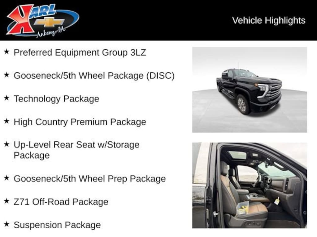 Recent Arrival! CARFAX One-Owner, Local Trade, Sold New at Karls & All Services Done at Karls! Equipped With Running Boards, Mud Flaps & Bed Liner! Clean CARFAX. Certified. Black 2024 Chevrolet Silverado 2500HD High Country 4WD CREW CAB 159 HIGH COUNTRY Duramax 6.6L V8 Turbodiesel 10-Speed Automatic, 4WD, Jet Black/Umber Leather, 15 Diagonal Multicolor Head-Up Display, 170 Amp Alternator, 6 Rectangular Chromed Tubular Assist Steps, Adaptive Cruise Control, Apple CarPlay/Android Auto, Auto High-beam Headlights, Auto-Dimming Inside Rear-View Mirror, Bed View Camera w/2 Trailer Camera Provisions, Bluetooth® For Phone, BOSE Premium 7-Speaker Sound System, Chevrolet Connected Access Capable, Chrome Door Handles, Chrome Mirror Caps, Color-Keyed Carpeting Floor Covering, Compass, Deep-Tinted Glass, Electric Rear-Window Defogger, Electronic Cruise Control w/Set & Resume Speed, EZ Lift Power Lock & Release Tailgate, Front Carpeted Floor Mats, Front Chrome Recovery Hooks, Front dual zone A/C, Front LED Fog Lamps, Front Rain-Sensing Wipers, Gooseneck/5th Wheel Package (DISC), Gooseneck/5th Wheel Prep Package, Heated 2nd Row Outboard Seats, Heated Driver & Front Outboard Passenger Seating, Heated Steering Wheel, High Country Premium Package, Hill Descent Control, Hitch Guidance w/Hitch View, In-Vehicle Trailering App System, Keyless Open & Start, LED Cargo Area Lighting, Manual Tilt & Telescoping Steering Column, Memory seat, Off-Road Suspension, OnStar & Chevrolet Connected Services Capable, Polished Exhaust Tip, Power Door Locks, Power driver seat, Power Sliding Rear Window w/Defogger, Power Sunroof, Power windows, Preferred Equipment Group 3LZ, Push Button Start, Pwr Up/Down Tailgate Function w/Pwr Lock & Release, Rear Camera Mirror, Rear Carpeted Floor Mats, Rear Cross Traffic Alert, Rear Wheelhouse Liners, Remote Vehicle Starter System, SiriusXM w/360L, Standard Tailgate, Steering Wheel Audio Controls, Suspension Package, Technology Package, Trailer Camera Provisions, Ultrasonic Front & Rear Park Assist, Unauthorized Entry Theft-Deterrent System, Universal Home Remote, Up-Level Rear Seat w/Storage Package, Ventilated Driver & Front Passenger Seats, Wheels: 20 8-Spoke Polished, Wi-Fi Hotspot Capable, Wireless Charging, Wireless Phone Projection, Wrapped Steering Wheel, Z71 Off-Road Package. 10-Speed Automatic 4WDCertification Program Details: Karl Chevrolet of Ankeny, your newest CarBravo dealer, where platinum quality vehicles and unmatched benefits come together! -Comprehensive Limited Bumper to Bumper Warranty. -24/7 Roadside Assistance: -Multi-Point Vehicle Inspection: Every vehicle undergoes a Platinum Quality Certified Inspection known throughout the industry to ensure top quality. -Vehicle Exchange Program. Within 10-Days and 500 miles -Complimentary Vehicle History Report -Nationwide Dealer Network Support: Enjoy the backing of the extensive CarBravo and GM dealership network. -OnStar and SiriusXM Trials: Enjoy connected services and entertainment with included trial subscriptions. -Terms and conditions may apply. With every vehicle purchased, you'll enjoy the peace of mind that comes with a limited warranty, 24/7 roadside assistance, and a comprehensive vehicle inspection.