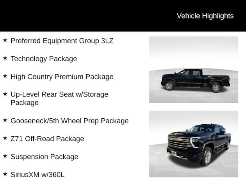 120-Volt Bed Mounted Power Outlet, 120-Volt Interior Power Outlet, 15 Diagonal Multicolor Head-Up Display, 170 Amp Alternator, 6 Rectangular Chromed Tubular Assist Steps, Adaptive Cruise Control, Auto-Dimming Inside Rear-View Mirror, Bed View Camera w/2 Trailer Camera Provisions, Black Chevytec Spray-On Bedliner, Bluetooth® For Phone, Chevrolet Connected Access Capable, Chrome Door Handles, Chrome Mirror Caps, Color-Keyed Carpeting Floor Covering, Compass, Deep-Tinted Glass, Electric Rear-Window Defogger, Electronic Cruise Control w/Set & Resume Speed, Front Carpeted Floor Mats, Front Chrome Recovery Hooks, Front LED Fog Lamps, Front Rain-Sensing Wipers, Gooseneck/5th Wheel Prep Package, Heated 2nd Row Outboard Seats, Heated Steering Wheel, High Country Premium Package, Hill Descent Control, Hitch Guidance w/Hitch View, In-Vehicle Trailering App System, Keyless Open & Start, LED Cargo Area Lighting, Manual Tilt & Telescoping Steering Column, Off-Road Suspension, OnStar & Chevrolet Connected Services Capable, Polished Exhaust Tip, Power Door Locks, Power Front Windows w/Driver Express Up/Down, Power Front Windows w/Passenger Express Up/Down, Power Rear Windows w/Express Down, Power Sliding Rear Window w/Defogger, Power Sunroof, Preferred Equipment Group 3LZ, Push Button Start, Pwr Up/Down Tailgate Function w/Pwr Lock & Release, Rear Camera Mirror, Rear Carpeted Floor Mats, Rear Cross Traffic Alert, Rear Wheelhouse Liners, Remote Vehicle Starter System, SiriusXM w/360L, Standard Tailgate, Steering Wheel Audio Controls, Suspension Package, Technology Package, Trailer Camera Provisions, Ultrasonic Front & Rear Park Assist, Unauthorized Entry Theft-Deterrent System, Universal Home Remote, Up-Level Rear Seat w/Storage Package, Wi-Fi Hotspot Capable, Wireless Charging, Wireless Phone Projection, Wrapped Steering Wheel, Z71 Off-Road Package.