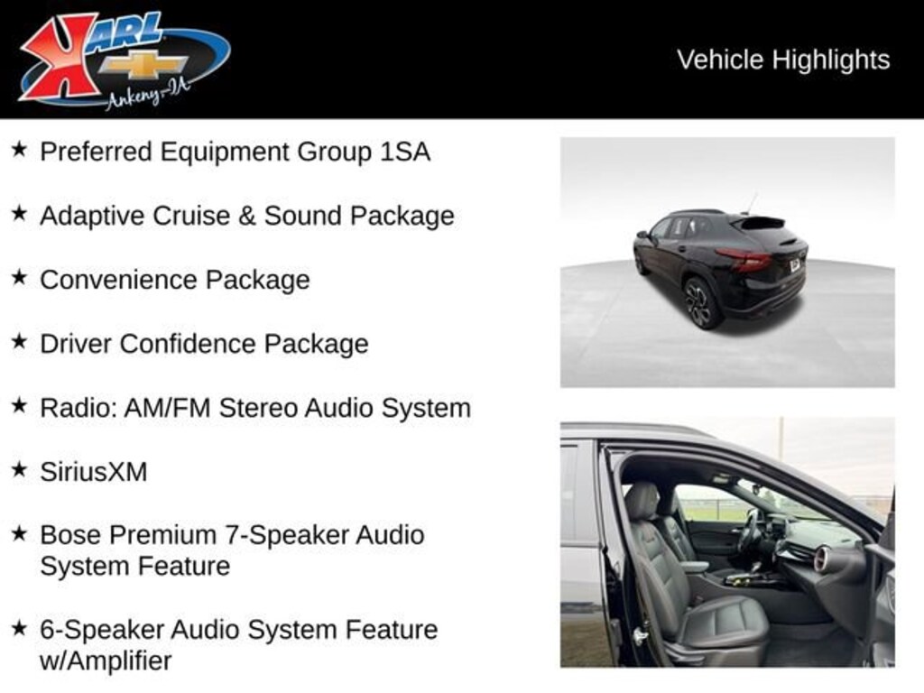Recent Arrival! CARFAX One Owner, Local Trade & Sold New at Karls! Clean CARFAX. Certified. Mosaic Black Metallic 2024 Chevrolet TrailBlazer ACTIV 4DR AWD ACTIV 1.3L Ecotec Turbo DOHC SIDI w/VVT 11 Diagonal HD Color Touchscreen, 120-Volt Power Outlet, 6-Speaker Audio System Feature w/Amplifier, Adaptive Cruise & Sound Package, Adaptive Cruise Control, Auto High-beam Headlights, Bose Premium 7-Speaker Audio System Feature, Cabin Humidity Sensor, Chevrolet Connected Access Capable, Convenience Package, Driver & Front Passenger Illuminated Vanity Mirrors, Driver Confidence Package, Exterior Parking Camera Rear, Hands-Free Power Programmable Liftgate, Heated Driver & Front Passenger Seats, Heated steering wheel, Inside Rear-View Auto-Dimming Mirror, Lane Change Alert w/Side Blind Zone Alert, Power driver seat, Preferred Equipment Group 1SA, Radio: AM/FM Stereo Audio System, Rear Cross Traffic Alert, Rear Park Assist, Single-Zone Auto Climate Control Air Conditioning, SiriusXM, Summit White Two-Tone Roof, Wheels: 17 High Gloss Black Machined Aluminum, Wireless Apple CarPlay/Android Auto, Wireless Charging. 26/29 City/Highway MPG 9-Speed Automatic AWDAt Karl Chevrolet we want to help you find the best new or used car in Ankeny that suits your needs. Check out the 2024 Chevrolet TrailBlazer For Sale in Ankeny, IA. When you buy a new car at Karl Chevrolet you know you're finding a vehicle you can rely on. We have a great selection of Platinum Quality Pre-Owned Vehicles. We also pride ourselves in creating a friendly atmosphere and reliable new car dealership that you can trust. Call us with any questions about our 2024 Chevrolet TrailBlazer and our experts will be glad to help you! (515) 299-4300. *Equipment and options are generated by a 3rd party vendor, exact vehicle options may vary. Please see a salesperson for complete details and vehicle information.Certification Program Details: Karl Chevrolet of Ankeny, The Nation's #1 CarBravo certified dealer, where platinum quality vehicles and unmatched benefits come together! This vehicle qualifies for our CarBravo Certified program reserved for the highest-quality pre-owned vehicles that are 10 model years or newer and have less than 100,000 miles. Every CarBravo Certified vehicle includes: ? Comprehensive 126-Point Inspection Professionally inspected by factory-trained technicians to meet strict mechanical, safety, and cosmetic standards. ? 6-Month / 6,000-Mile Bumper-to-Bumper Limited Warranty Enjoy added peace of mind with extensive coverage from the day you drive off the lot. ? 24/7 Roadside Assistance & Courtesy Transportation Flat tire? Dead battery? Need a tow? You're covered anywhere, anytime throughout the warranty period. ? Vehicle History & Title Guarantee Clean title, completed safety recalls, and a full CARFAX® or AutoCheck® report provided for complete transparency. ? 10-Day / 500-Mile Exchange Promise If you don't absolutely love it, bring it back and exchange it no hassle, no stress. Experience peace of mind and premium protection exclusively from Karl Chevrolet of Ankeny, the Nation's #1 CarBravo Certified Dealer!