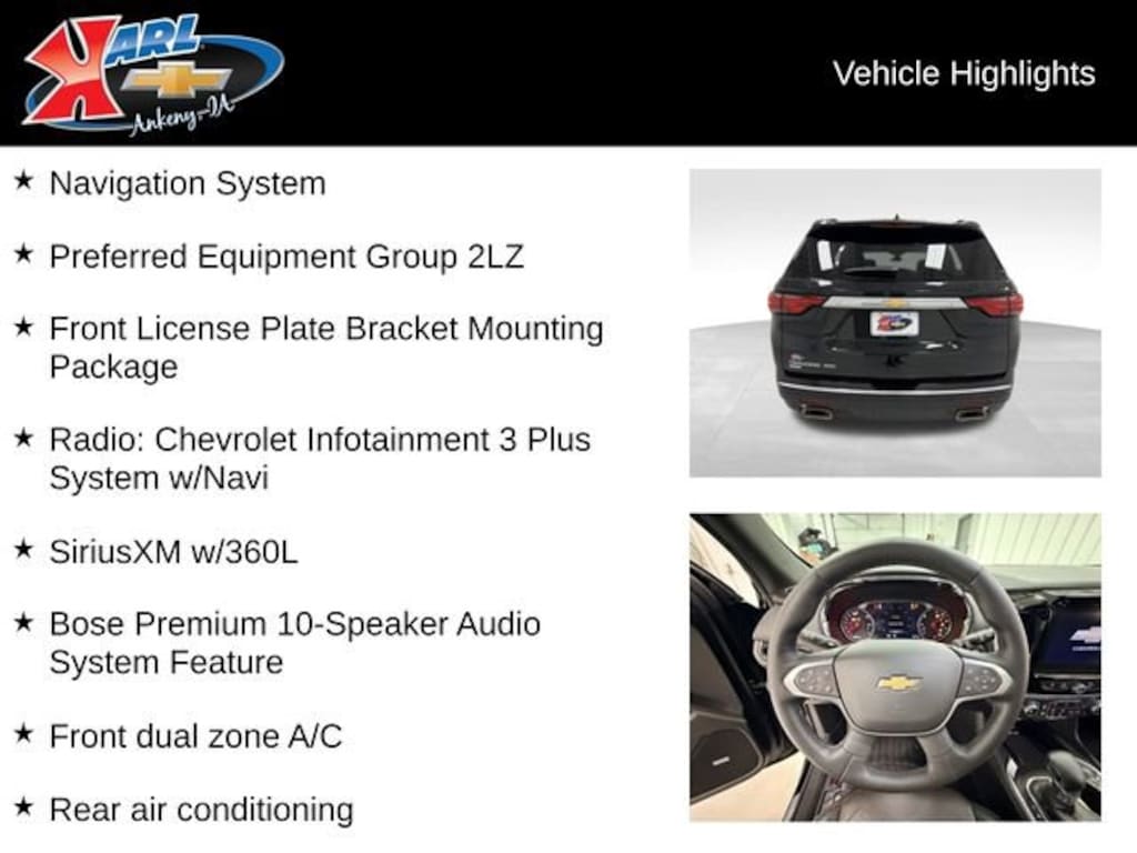 At Karl Chevrolet, we're committed to providing our customers with an exceptional buying experience. Our knowledgeable sales team is here to answer any questions you may have and help you find the perfect vehicle to fit your lifestyle. Visit us today and take this stunning Traverse for a test drive. We're confident you'll be impressed by its exceptional combination of style, performance, and premium features.