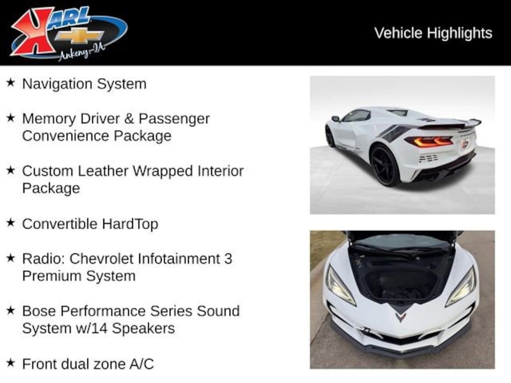 Recent Arrival! CARFAX One Owner, Local Trade, Sold New at Karls & All Services Done at Karls! Clean CARFAX. Certified. Arctic White 2025 Chevrolet Corvette E-Ray 3LZ 6.2L V8 8-Way Power Driver Seat Adjuster, 8-Way Power Passenger Seat Adjuster, Auto High-beam Headlights, Bose Performance Series Sound System w/14 Speakers, Convertible HardTop, Convertible roof lining, Custom Leather Wrapped Interior Package, Driver Power Bolster Seat Adjuster, Exterior Parking Camera Rear, Front dual zone A/C, Glass rear window, GT2 Bucket Seats, HD Front & Rear Vision Cameras, Heads-Up Display, Heated & Vented Driver & Passenger Seats, Heated Steering Wheel, Memory Driver & Passenger Convenience Package, Memory seat, Napa Lthr Seating Surfaces w/Perforated Inserts, Navigation System, Performance Data & Video Recorder, Radio: Chevrolet Infotainment 3 Premium System, Rear Cross Traffic Alert, Side Blind Zone Alert, Sport steering wheel, Steering wheel mounted audio controls, Sueded Microfiber-Wrapped Upper Interior Trim Pkg, Wheels: 20 x 10 Fr/21 x 13 Rr Pearl Nickel, Wireless Charging for Devices. 16/24 City/Highway MPG 8-Speed Dual Clutch AWDAt Karl Chevrolet we want to help you find the best new or used car in Ankeny that suits your needs. Check out the 2025 Chevrolet Corvette For Sale in Ankeny, IA. When you buy a new car at Karl Chevrolet you know you're finding a vehicle you can rely on. We have a great selection of Platinum Quality Pre-Owned Vehicles. We also pride ourselves in creating a friendly atmosphere and reliable new car dealership that you can trust. Call us with any questions about our 2025 Chevrolet Corvette and our experts will be glad to help you! (515) 299-4300. *Equipment and options are generated by a 3rd party vendor, exact vehicle options may vary. Please see a salesperson for complete details and vehicle information.Certification Program Details: Karl Chevrolet of Ankeny, The Nation's #1 CarBravo certified dealer, where platinum quality vehicles and unmatched benefits come together! This vehicle qualifies for our CarBravo Certified program reserved for the highest-quality pre-owned vehicles that are 10 model years or newer and have less than 100,000 miles. Every CarBravo Certified vehicle includes: ? Comprehensive 126-Point Inspection Professionally inspected by factory-trained technicians to meet strict mechanical, safety, and cosmetic standards. ? 6-Month / 6,000-Mile Bumper-to-Bumper Limited Warranty Enjoy added peace of mind with extensive coverage from the day you drive off the lot. ? 24/7 Roadside Assistance & Courtesy Transportation Flat tire? Dead battery? Need a tow? You're covered anywhere, anytime throughout the warranty period. ? Vehicle History & Title Guarantee Clean title, completed safety recalls, and a full CARFAX® or AutoCheck® report provided for complete transparency. ? 10-Day / 500-Mile Exchange Promise If you don't absolutely love it, bring it back and exchange it no hassle, no stress. Experience peace of mind and premium protection exclusively from Karl Chevrolet of Ankeny, the Nation's #1 CarBravo Certified Deale