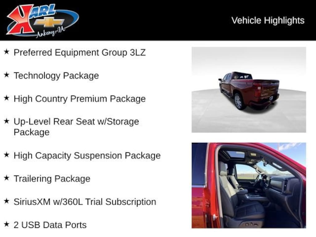 Recent Arrival! CARFAX One Owner, Local Trade, Sold New at Karls & All Services Done at Karls! Equipped With Tonneau Cover, Running Boards & Mud Flaps! Clean CARFAX. Certified. Radiant Red Tintcoat 2025 Chevrolet Silverado 1500 High Country 4WD CREW CAB 147 HIGH COUNTRY EcoTec3 5.3L V8 10-Speed Automatic, 4WD, Jet Black Leather, 12.3 Multicolor Reconfigurable Digital Display, 15 Diagonal Multicolor Head-Up Display, 2 USB Data Ports, 2nd Row Heated Outboard Seats, Adaptive Cruise Control, Auto High-beam Headlights, Auto-Dimming Inside Rear-View Mirror, Auto-Locking Rear Differential, Bed View Camera, Bluetooth® For Phone, Body-Color Painted Mirror Caps, Chevytec Spray-On Black Bedliner, Chrome Assist Steps, Chrome Recovery Hooks, Deep-Tinted Glass, Driver Memory, Dual Exhaust w/Polished Outlets, Dual Rear USB Ports (Charge Only), Electric Rear-Window Defogger, Forward Collision Alert, Front dual zone A/C, Front LED Fog Lamps, Front Rain-Sensing Wipers, HD Surround Vision, Heated Driver & Front Outboard Passenger Seats, Heated Steering Wheel, High Capacity Suspension Package, High Country Premium Package, Hitch Guidance w/Hitch View, In-Vehicle Trailering System App, Integrated Trailer Brake Controller, Keyless Open & Start, LED Cargo Area Lighting, OnStar Services Capable, Outside Heated Power-Adjustable Mirrors, Perimeter Lighting, Power driver seat, Power Sliding Rear Window w/Rear Defogger, Power Sunroof, Power Tailgate, Power Tilt & Telescoping Steering Column, Power windows, Preferred Equipment Group 3LZ, Premium Bose 7-Speaker Sound System, Rain sensing wipers, Rear Camera Mirror, Rear Cross Traffic Braking, Rear Wheelhouse Liners, Remote Vehicle Starter System, SiriusXM w/360L Trial Subscription, Steering Wheel Audio Controls, Technology Package, Teen Driver, Theft Deterrent System (Unauthorized Entry), Tire Pressure Monitoring System, Trailer Camera Provisions, Trailer Side Blind Zone Alert, Trailering Package, Ultrasonic Front & Rear Park Assist, Universal Home Remote, Up-Level Rear Seat w/Storage Package, Ventilated Driver & Front Passenger Seats, Wheels: 20 x 9 Painted Aluminum, Wheels: 22 x 9 Painted Aluminum, Wi-Fi Hot Spot Capable, Wrapped Steering Wheel. 16/19 City/Highway MPG 10-Speed Automatic 4WD