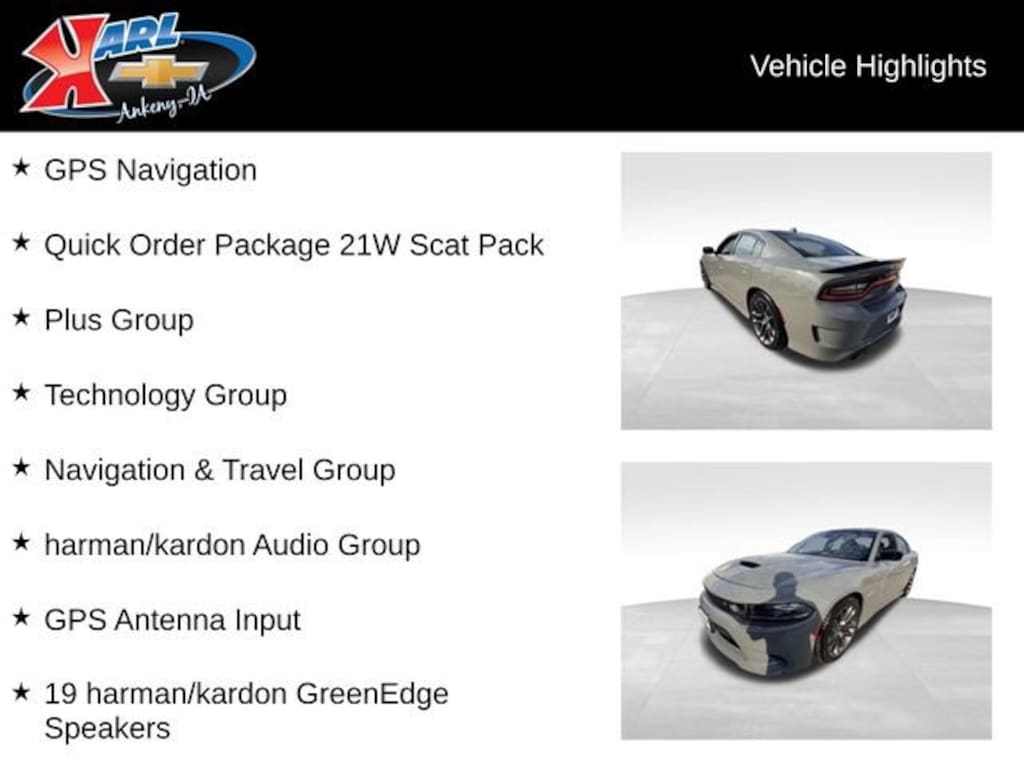 At Karl Chevrolet we want to help you find the best new or used car in Ankeny that suits your needs. Check out the 2023 Dodge Charger For Sale in Ankeny, IA. When you buy a new car at Karl Chevrolet you know you're finding a vehicle you can rely on. We have a great selection of Platinum Quality Pre-Owned Vehicles. We also pride ourselves in creating a friendly atmosphere and reliable new car dealership that you can trust. Call us with any questions about our 2023 Dodge Charger and our experts will be glad to help you! (515) 299-4300. *Equipment and options are generated by a 3rd party vendor, exact vehicle options may vary. Please see a salesperson for complete details and vehicle information.