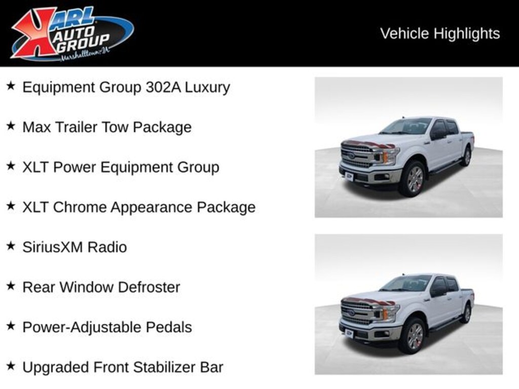 Recent Arrival! Odometer is 44192 miles below market average! Certified. CARFAX One-Owner. Clean CARFAX. Oxford White 2019 Ford F-150 4D SuperCrew XLT 3.5L V6 EcoBoost 17/23 City/Highway MPG 10-Speed Automatic 4WD, 10-Way Power Driver & Passenger Seats, 2-Bar Style Grille w/Chrome 2 Minor Bars, 4.2" Productivity Screen in Instrument Cluster, Auto-Dimming Rear-View Mirror, Chrome Door & Tailgate Handles w/Body-Color Bezel, Chrome Step Bars, Class IV Trailer Hitch Receiver, Cloth 40/20/40 Front Seat, Engine Oil Cooler, Equipment Group 302A Luxury, Extended Range 36 Gallon Fuel Tank, Fixed Backlight w/Privacy Glass, Heated Front Seats, Integrated Trailer Brake Controller, Leather-Wrapped Steering Wheel, LED Box Lighting, Max Trailer Tow Package, Power Glass Heated Sideview Mirrors, Power-Adjustable Pedals, Power-Sliding Rear Window, Pro Trailer Backup Assist, Rear Under-Seat Storage, Rear Window Defroster, Remote Start System, Single-Tip Chrome Exhaust, SiriusXM Radio, Upgraded Front Stabilizer Bar, Wheels: 18" Chrome-Like PVD, XLT Chrome Appearance Package, XLT Power Equipment Group.