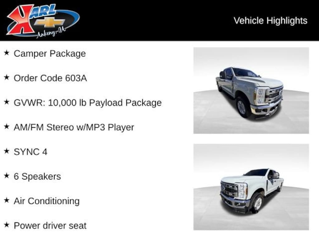 Recent Arrival! CARFAX One-Owner! Equipped With Bed Liner & Tonneau Cover! Clean CARFAX. Certified. Avalanche 2025 Ford F-250SD XLT XLT 4WD SUPERCAB 8' BOX 7.3L V8 PFI SOHC 16V Federal 405hp 4WD, 6 Speakers, Air Conditioning, Alloy wheels, AM/FM Stereo w/MP3 Player, Auto High-beam Headlights, Camper Package, Exterior Parking Camera Rear, GVWR: 10,000 lb Payload Package, LED Roof Clearance Lights, Order Code 603A, Platform Running Boards, Power driver seat, Power windows, PowerScope Trailer Tow Mirrors w/Heat, Rear Stabilizer Bar & Auxiliary Springs, SYNC 4. 10-Speed Automatic 4WDAt Karl Chevrolet we want to help you find the best new or used car in Ankeny that suits your needs. Check out the 2025 Ford F-250SD For Sale in Ankeny, IA. When you buy a new car at Karl Chevrolet you know you're finding a vehicle you can rely on. We have a great selection of Platinum Quality Pre-Owned Vehicles. We also pride ourselves in creating a friendly atmosphere and reliable new car dealership that you can trust. Call us with any questions about our 2025 Ford F-250SD and our experts will be glad to help you! (515) 299-4300. *Equipment and options are generated by a 3rd party vendor, exact vehicle options may vary. Please see a salesperson for complete details and vehicle information.Certification Program Details: Karl Chevrolet of Ankeny, your newest CarBravo dealer, where platinum quality vehicles and unmatched benefits come together! -Comprehensive Limited Bumper to Bumper Warranty. -24/7 Roadside Assistance: -Multi-Point Vehicle Inspection: Every vehicle undergoes a Platinum Quality Certified Inspection known throughout the industry to ensure top quality. -Vehicle Exchange Program. Within 10-Days and 500 miles -Complimentary Vehicle History Report -Nationwide Dealer Network Support: Enjoy the backing of the extensive CarBravo and GM dealership network. -OnStar and SiriusXM Trials: Enjoy connected services and entertainment with included trial subscriptions. -Terms and conditions may apply. With every vehicle purchased, you'll enjoy the peace of mind that comes with a limited warranty, 24/7 roadside assistance, and a comprehensive vehicle inspection.