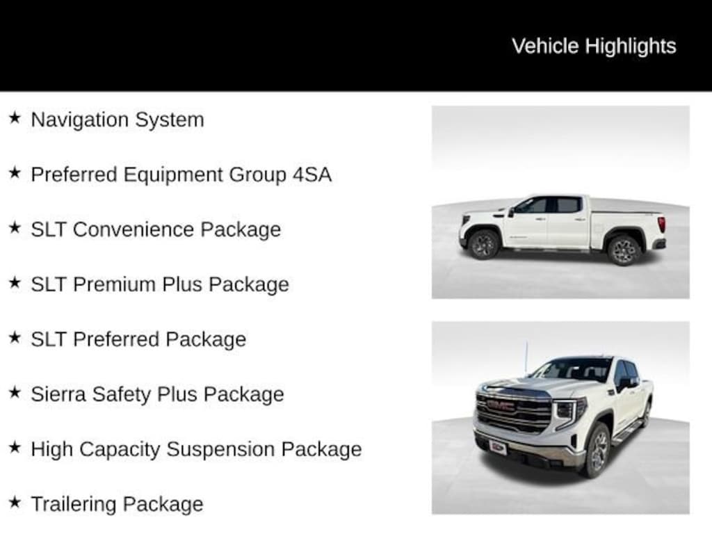 The Sierra's stunning White exterior is complemented by a wealth of premium features, including the SLT PREMIUM PLUS PACKAGE, which adds a host of convenience and technology enhancements. Enjoy the convenience of a Navigation System, the immersive sound of a Premium Bose 7-Speaker Sound System, and the seamless integration of SiriusXM w/360L. The Integrated Trailer Brake Controller and Wireless Charging further elevate the Sierra's versatility and functionality.
