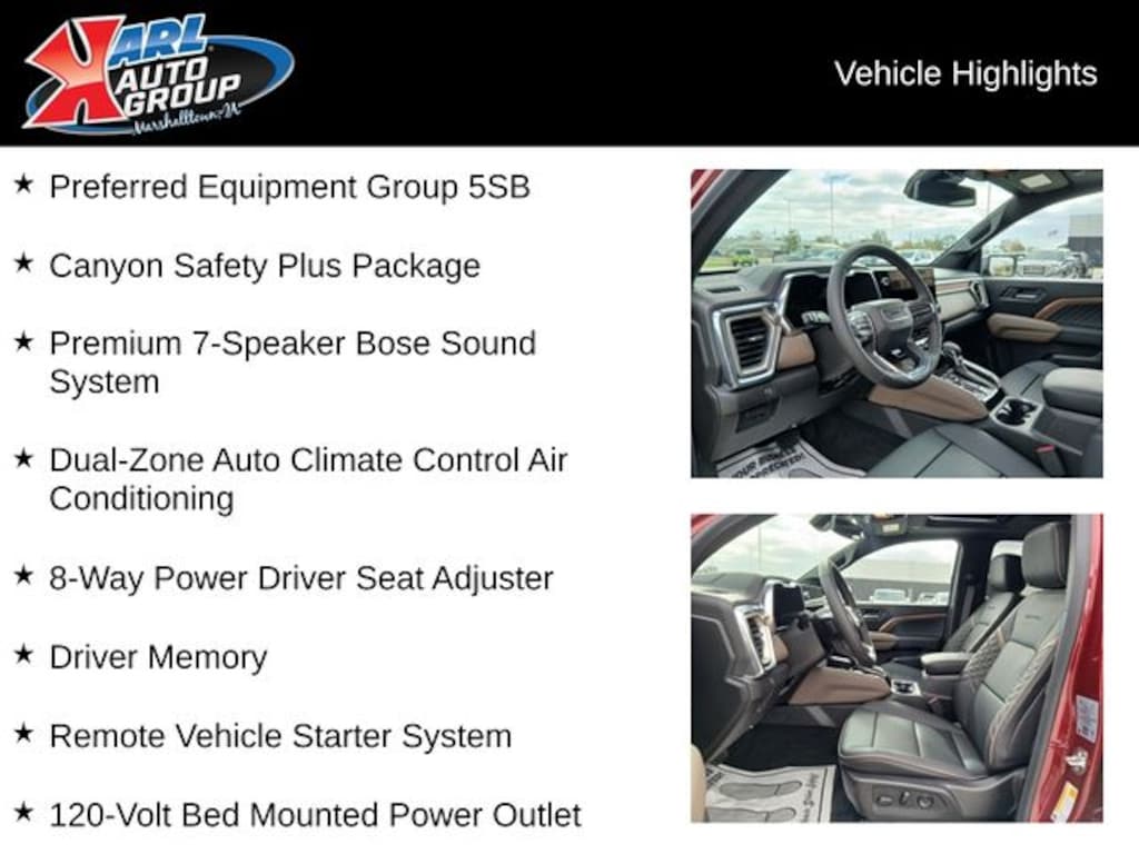 Recent Arrival! Certified. Clean CARFAX. Volcanic Red 2026 GMC Canyon 4D Crew Cab Denali 2.7L I4 Turbocharged DOHC 16V LEV3-SULEV30 310hp 18/22 City/Highway MPG 8-Speed Automatic 4WD, 120-Volt Bed Mounted Power Outlet, 2 Rear USB Ports in Center Console (Charge-Only), 5" Rectangular Chrome Assist Steps, 6-Way Power Passenger Seat Adjuster, 8-Way Power Driver Seat Adjuster, Adaptive Cruise Control, Automatic Emergency Braking, Blind Zone Steering Assist w/Trailering, Canyon Pro Safety, Canyon Safety Plus Package, Driver & Front Passenger Illuminated Visors, Driver & Front Passenger Ventilated Seats, Driver Memory, Driver Seatback Map Pocket, Dual-Zone Auto Climate Control Air Conditioning, EZ-Lift & Lower Tailgate, Following Distance Indicator, Forward Collision Alert, Front LED Fog Lamps, Front Pedestrian & Bicyclist Braking, HD Surround Vision, Heated Driver & Front Passenger Seats, Heated Steering Wheel, Inside Rear-View Auto-Dimming Mirror, IntelliBeam Automatic High Beam On/Off, Interior Overhead Courtesy Light w/Dual Reading Lamp, Lane Keep Assist w/Lane Departure Warning, Multicolor 6.3" Diagonal Head-Up Display, MultiStow Tailgate Storage Compartment, Power Driver Lumbar Control Seat Adjuster, Power Passenger Lumbar Control Seat Adjuster, Preferred Equipment Group 5SB, Premium 7-Speaker Bose Sound System, Rear Center Fold-Down Armrest w/2 Cupholders, Rear Cross Traffic Braking, Rear of Console 120-Volt Power Outlet, Rear Pedestrian Alert, Remote Vehicle Starter System, Safety Alert Seat, Spray-On Bedliner w/GMC Logo, Tailgate Keyed Cylinder Lock, Tilt & Telescopic Manual Steering Column, Ultrasonic Rear Park Assist, Wireless Phone Charging.