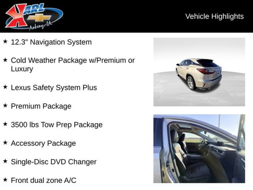 Discover the ultimate in luxury and performance with this stunning 2016 Lexus RX 350 4DR AWD. Boasting an impressive 3.5L V6 DOHC 24V engine paired with an 8-Speed Automatic transmission, this vehicle delivers exceptional power and efficiency, with an EPA-estimated 19 city/26 highway MPG.Tailored to your needs, this RX 350 comes equipped with a remarkable array of features, including:- Blind Spot Monitor with Rear Cross Traffic Alert- Lexus Safety System Plus with Pre-Collision System, Automatic High Beams, and Lane Departure Alert- 12.3 Navigation System with Advanced Voice Command- Heated and Ventilated Front Seats- Power Tilt and Slide Moonroof- Intuitive Parking Assist- And much more.The stunning Beige exterior, complemented by the Matte Linear Dark Mocha Wood interior trim, creates a sophisticated and refined aesthetic that is sure to turn heads. With only 23,649 miles, this RX 350 has been meticulously maintained and is ready to provide you with years of reliable, comfortable, and enjoyable driving.As a Certified Pre-Owned Lexus, this vehicle has undergone a rigorous multi-point inspection and comes with a comprehensive warranty, ensuring your peace of mind and confidence in your purchase. Lexus is renowned for its exceptional build quality, advanced safety features, and unparalleled customer satisfaction, making this RX 350 a truly exceptional find.At Karl Chevrolet, we understand the importance of finding the right vehicle that meets your needs and exceeds your expectations. This 2016 Lexus RX 350 4DR AWD is a remarkable opportunity to experience the pinnacle of luxury and performance. We invite you to visit our showroom and take this exceptional vehicle for a test drive. Our knowledgeable sales team is here to assist you every step of the way, ensuring you find the perfect car that fits your lifestyle.At Karl Chevrolet we want to help you find the best new or used car in Ankeny that suits your needs. When you buy a new car at Karl Chevrolet you know you're finding a vehicle you can rely on. We have a great selection of Platinum Quality Pre-Owned Vehicles. We also pride ourselves in creating a friendly atmosphere and a reliable Dealership that you can trust. Call us and our experts will be glad to help you! (515) 299-4300. *Equipment and options are generated by a 3rd party vendor, exact vehicle options may vary. Please see a salesperson for complete details and vehicle information.