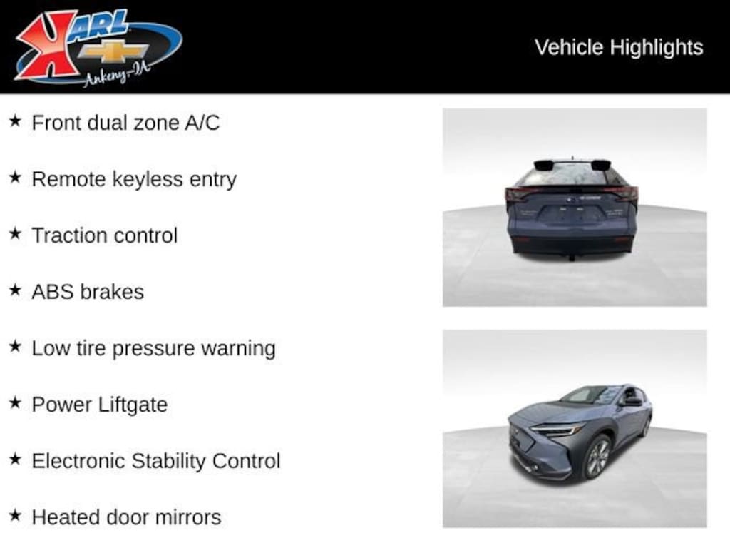 Recent Arrival! CARFAX One-Owner. Gray Pearl 2023 Subaru Solterra Limited LIMITED AWD Electric Motor ABS brakes, Alloy wheels, Electronic Stability Control, Front dual zone A/C, Heated door mirrors, Heated Front Bucket Seats, Heated front seats, Heated rear seats, Illuminated entry, Low tire pressure warning, Power Liftgate, Remote keyless entry, Traction control. 1-Speed Automatic AWDAt Karl Chevrolet we want to help you find the best new or used car in Ankeny that suits your needs. Check out the 2023 Subaru Solterra For Sale in Ankeny, IA. When you buy a new car at Karl Chevrolet you know you're finding a vehicle you can rely on. We have a great selection of Platinum Quality Pre-Owned Vehicles. We also pride ourselves in creating a friendly atmosphere and reliable new car dealership that you can trust. Call us with any questions about our 2023 Subaru Solterra and our experts will be glad to help you! (515) 299-4300. *Equipment and options are generated by a 3rd party vendor, exact vehicle options may vary. Please see a salesperson for complete details and vehicle information.