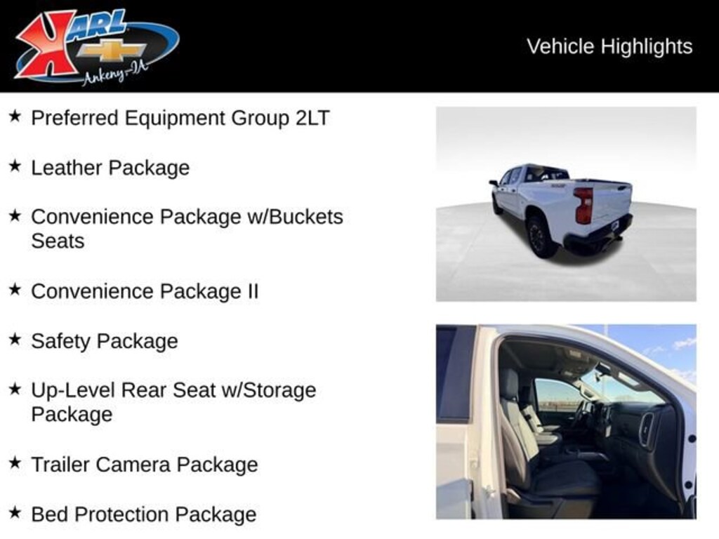 Recent Arrival! CARFAX One-Owner & Local Trade! Equipped With Tonneau Cover! Clean CARFAX. Certified. Summit White 2020 Chevrolet Silverado 1500 LT Trail Boss 4WD CREW CAB 147 LT TRAIL BOSS EcoTec3 6.2L V8 10-Speed Automatic, 4WD, Black Leather, 10-Way Power Driver Seat w/Lumbar, 170 Amps Alternator, 2 USB Ports, 2 USB Ports (First Row), 4.2 Diagonal Color Display Driver Info Center, 4G LTE Wi-Fi Hot Spot Capable, 6-Speaker Audio System, Advanced Trailering Package, Apple CarPlay/Android Auto, Auxiliary External Transmission Oil Cooler, Bed Protection Package, Bed View Camera, Bluetooth® For Phone, Chevrolet Connected Access Capable, Chevytec Spray-On Black Bedliner, Convenience Package II, Convenience Package w/Buckets Seats, Deep-Tinted Glass, Dual Exhaust w/Polished Outlets, Dual-Zone Automatic Climate Control, Electric Rear-Window Defogger, Electrical Lock Control Steering Column, Front LED Fog Lamps, HD Radio, HD Rear Vision Camera, Heated Driver & Front Outboard Passenger Seats, Heated Steering Wheel, Heavy-Duty Rear Locking Differential, High Capacity Air Filter, High Gloss Black Grille, High Gloss Black Mirror Caps, Hill Descent Control, Hitch Guidance w/Hitch View, Integrated Trailer Brake Controller, Keyless Open & Start, Lane Change Alert w/Side Blind Zone Alert, Leather Package, Leather Wrapped Steering Wheel, LED Cargo Area Lighting, LED Reflector Headlamps, OnStar & Chevrolet Connected Services Capable, Performance Red Recovery Hooks, Perimeter Lighting, Power Door Locks, Power Sliding Rear Window w/Rear Defogger, Power windows, Preferred Equipment Group 2LT, Premium Bose 7-Speaker Sound System, Radio: Chevrolet Infotainment 3 Plus System, Rear Cross Traffic Alert, Rear Dual USB Charging-Only Ports, Rear Vision Camera, Rear Wheelhouse Liners, Remote Vehicle Starter System, Safety Package, Single-Zone Manual/Semi-Automatic Air Conditioning, SiriusXM w/360L, Steering Wheel Audio Controls, Steering Wheel Mounted Electronic Cruise Control, Suspension Package, Theft Deterrent System (Unauthorized Entry), Trailer Camera Package, Trailering Package, Ultrasonic Front & Rear Park Assist, Universal Home Remote, Up-Level Rear Seat w/Storage Package, Wheels: 18 x 8.5 Black Painted Aluminum. 15/19 City/Highway MPG 10-Speed Automatic 4WDCertification Program Details: Karl Chevrolet of Ankeny, The Nation's #1 CarBravo certified dealer, where platinum quality vehicles and unmatched benefits come together! This vehicle qualifies for our CarBravo Certified program reserved for the highest-quality pre-owned vehicles that are 10 model years or newer and have less than 100,000 miles. Every CarBravo Certified vehicle includes: ? Comprehensive 126-Point Inspection Professionally inspected by factory-trained technicians to meet strict mechanical, safety, and cosmetic standards. ? 6-Month / 6,000-Mile Bumper-to-Bumper Limited Warranty Enjoy added peace of mind with extensive coverage from the day you drive off the lot. ? 24/7 Roadside Assistance & Courtesy Transportation Flat tire? Dead battery? Need a tow? You're covered anywhere, anytime throughout the warranty period. ? Vehicle History & Title Guarantee Clean title, completed safety recalls, and a full CARFAX® or AutoCheck® report provided for complete transparency. ? 10-Day / 500-Mile Exchange Promise If you don't absolutely love it, bring it back and exchange it no hassle, no stress. Experience peace of mind and premium protection exclusively from Karl Chevrolet of Ankeny, the Nation's #1 CarBravo Certified Deale