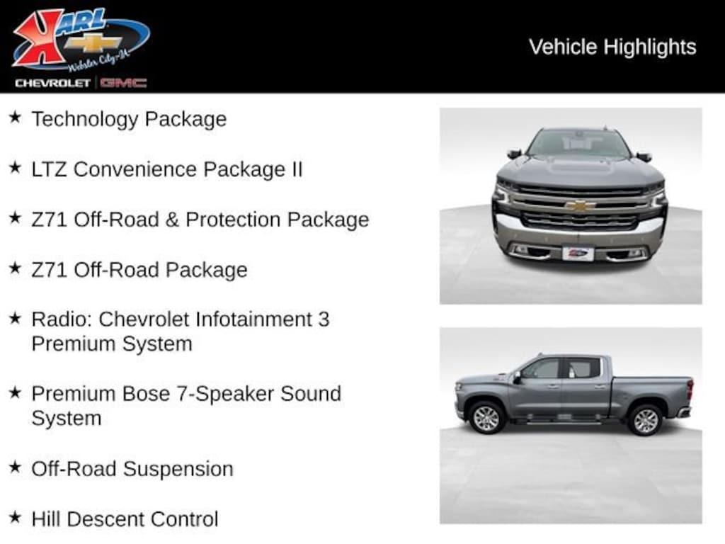 At Karl Chevrolet/GMC, we're committed to providing our customers with the best possible shopping experience. Our knowledgeable sales team is here to answer any questions you may have and help you find the perfect vehicle to fit your needs. We invite you to come in and take this impressive Silverado LTZ for a test drive. We're confident you'll be impressed by its capabilities, features, and the unbeatable value it offers.