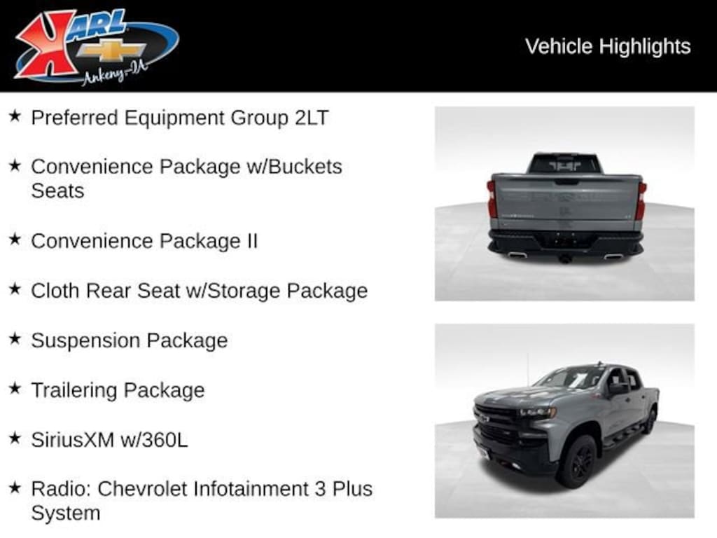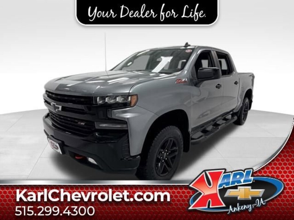 Recent Arrival! CARFAX One-Owner, Local Trade & Sold New at Karls! Equipped With Running Boards, Mud Flaps & Rev-Hard Folding Tonneau Cover! Clean CARFAX. Certified. Satin Steel Metallic 2021 Chevrolet Silverado 1500 LT Trail Boss 4WD CREW CAB 147 LT TRAIL BOSS EcoTec3 5.3L V8 10-Speed Automatic, 4WD, Black Cloth, 10-Way Power Driver Seat w/Lumbar, 170 Amp Alternator, 2 USB Ports, 2 USB Ports (First Row), 4.2 Diagonal Color Display Driver Info Center, 4G LTE Wi-Fi Hot Spot Capable, 6-Speaker Audio System, All-Weather Floor Liner (LPO) (AAK), Apple CarPlay/Android Auto, Auto-Locking Rear Differential, Auxiliary External Transmission Oil Cooler, Bluetooth® For Phone, Chevrolet Connected Access Capable, Cloth Rear Seat w/Storage Package, Color-Keyed Carpeting Floor Covering, Compass, Convenience Package II, Convenience Package w/Buckets Seats, Deep-Tinted Glass, Dual Exhaust w/Polished Outlets, Dual-Zone Automatic Climate Control, Electric Rear-Window Defogger, Electrical Lock Control Steering Column, Electronic Cruise Control, EZ Lift Power Lock & Release Tailgate, Floor Mounted Center Console, Front LED Fog Lamps, HD Radio, HD Rear Vision Camera, Heated Driver & Front Outboard Passenger Seats, Heated Steering Wheel, Heavy-Duty Air Filter, High Gloss Black Grille, High Gloss Black Mirror Caps, Hill Descent Control, Hitch Guidance, Integrated Trailer Brake Controller, Keyless Open & Start, Leather Wrapped Steering Wheel, LED Cargo Area Lighting, LED Reflector Headlamps, Manual Tilt/Telescoping Steering Column, OnStar & Chevrolet Connected Services Capable, Performance Red Recovery Hooks, Power Door Locks, Power driver seat, Power Sliding Rear Window w/Rear Defogger, Power windows, Preferred Equipment Group 2LT, Premium Bose 7-Speaker Sound System, Radio: Chevrolet Infotainment 3 Plus System, Rear Dual USB Charging-Only Ports, Rear Vision Camera, Remote Vehicle Starter System, SiriusXM w/360L, Standard Tailgate, Steering Wheel Audio Controls, Suspension Package, Theft Deterrent System (Unauthorized Entry), Trailering Package, Universal Home Remote, Wheels: 18 x 8.5 Black Painted Aluminum, Wireless Phone Projection. 15/21 City/Highway MPG 10-Speed Automatic 4WD