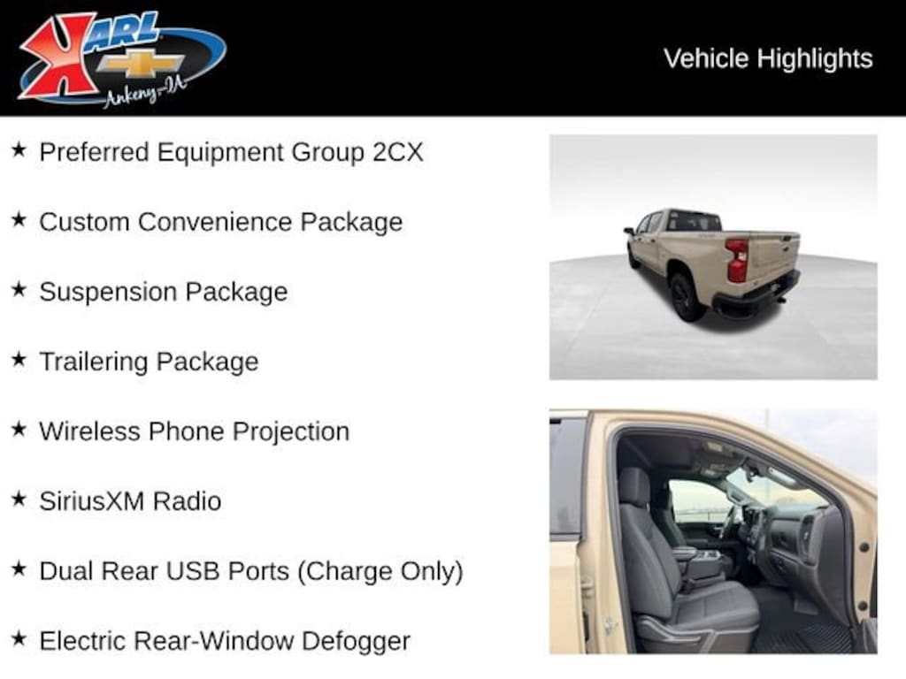 At Karl Chevrolet we want to help you find the best new or used car in Ankeny that suits your needs. When you buy a new car at Karl Chevrolet you know you're finding a vehicle you can rely on. We have a great selection of Platinum Quality Pre-Owned Vehicles. We also pride ourselves in creating a friendly atmosphere and a reliable Dealership that you can trust. Call us and our experts will be glad to help you! (515) 299-4300. *Equipment and options are generated by a 3rd party vendor, exact vehicle options may vary. Please see a salesperson for complete details and vehicle information.