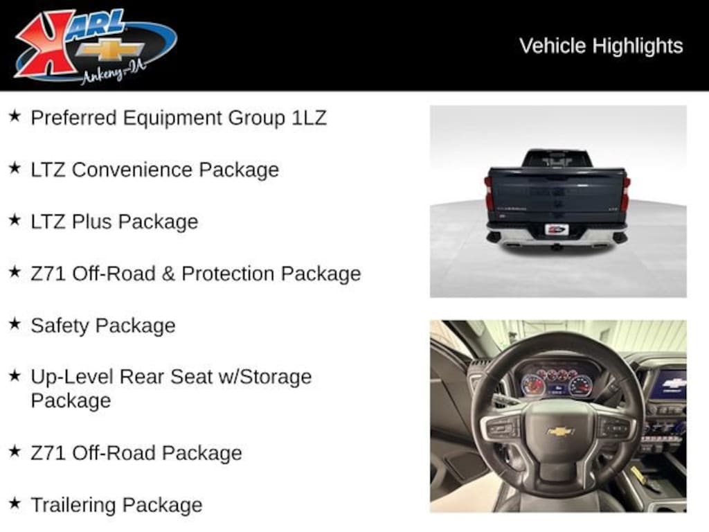 Certification Program Details: Karl Chevrolet of Ankeny, The Nation's #1 CarBravo Certified Dealer! Every CarBravo Certified vehicle includes: Comprehensive 126-Point Inspection Professionally inspected by factory-trained technicians to meet strict mechanical, safety, and cosmetic standards. 12-Month / 12,000-Mile Bumper-to-Bumper Limited Warranty Enjoy added peace of mind with extensive coverage from the day you drive off the lot. 24/7 Roadside Assistance & Courtesy Transportation Flat tire? Dead battery? Need a tow? You're covered anywhere, anytime throughout the warranty period. Vehicle History & Title Guarantee Clean title, completed safety recalls, and a full CARFAX® or AutoCheck® report provided for complete transparency. 10-Day / 500-Mile Exchange Promise If you don't absolutely love it, bring it back and exchange it no hassle, no stress. Experience peace of mind and premium protection exclusively from Karl Chevrolet of Ankeny, the Nation's #1 CarBravo Dealer!- Floor Liners, with Removable Carpet Inserts, Front- Z71 Off-Road and Protection Package- Molded Splash Guards, Black (dealer-installed)This 2022 Chevrolet Silverado 1500 LTD LTZ 4WD Crew Cab is equipped with a powerful EcoTec3 5.3L V8 engine and an 8-speed automatic transmission, delivering a confident and capable performance. With its rugged 4WD system, this Silverado is ready to tackle any terrain, whether you're hauling heavy loads or exploring off-road adventures. The Z71 Off-Road and Protection Package further enhances its off-road capabilities, with features like Hill Descent Control, skid plates, and all-terrain tires.Inside, this Silverado offers a wealth of premium features, including a Bose premium audio system, wireless phone projection, and a host of advanced safety technologies like Lane Change Alert with Side Blind Zone Alert and Rear Cross Traffic Alert. The roomy Crew Cab design provides ample space for passengers and cargo, making it the perfect choice for both work and play.Certified through Karl Chevrolet's exclusive CarBravo program, this Silverado has undergone a rigorous 126-point inspection by factory-trained technicians. It comes with a 12-month/12,000-mile bumper-to-bumper limited warranty, 24/7 roadside assistance, and a 10-day/500-mile exchange promise, giving you the peace of mind you deserve.At Karl Chevrolet, we're committed to providing our customers with the highest level of service and the best vehicles on the market. This 2022 Chevrolet Silverado 1500 LTD LTZ 4WD Crew Cab is a true testament to our dedication to excellence. Come experience the difference at Karl Chevrolet of Ankeny, the Nation's #1 CarBravo Dealer!At Karl Chevrolet we want to help you find the best new or used car in Ankeny that suits your needs. When you buy a new car at Karl Chevrolet you know you're finding a vehicle you can rely on. We have a great selection of Platinum Quality Pre-Owned Vehicles. We also pride ourselves in creating a friendly atmosphere and a reliable Dealership that you can trust. Call us and our experts will be glad to help you! (515) 299-4300. *Equipment and options are generated by a 3rd party vendor, exact vehicle options may vary. Please see a salesperson for complete details and vehicle information.