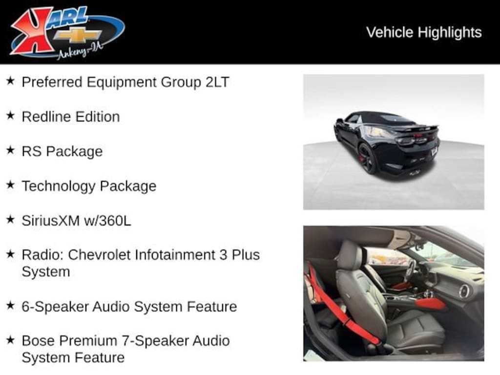 Recent Arrival! CARFAX One-Owner & Local Trade! Clean CARFAX. Certified. Black 2024 Chevrolet Camaro 2LT 2DR CONV 2LT 3.6L V6 DI 6-Speaker Audio System Feature, 6-Way Power Front Passenger Seat Adjuster, 8-Way Power Driver Seat Adjuster, Alloy Sport Pedals, Apple CarPlay/Android Auto, Black Camaro Emblem Fender Badge w/Red Outline, Black Lug Nuts (LPO), Bluetooth® For Phone, Bose Premium 7-Speaker Audio System Feature, Convertible roof lining, Dark Tint LED Tail Lamps, Exterior Parking Camera Rear, Front dual zone A/C, Front Sport Bucket Seats, Heated Driver & Front Passenger Seats, Lower Grille w/Red Hot Inserts, Preferred Equipment Group 2LT, Radio: Chevrolet Infotainment 3 Plus System, Red Knee Pads, Red Seat Belt Color, Redline Edition, Redline Edition Graphics, RS Package, SiriusXM w/360L, Technology Package, Ventilated Driver & Front Passenger Seats, Wheels: 20 5-Split Spoke Machined-Face Aluminum, Wheels: 20 Black-Painted Aluminum w/Red Accents. 16/26 City/Highway MPG 6-Speed Manual RWD