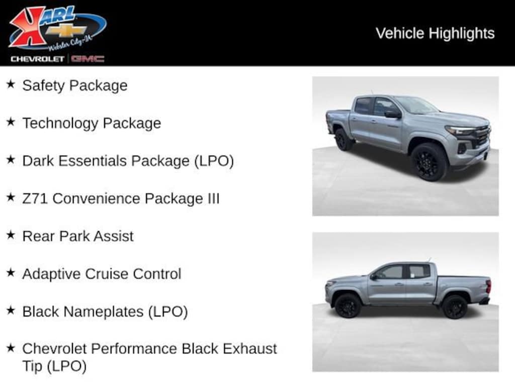 This 2024 Chevrolet Colorado Z71 is the perfect blend of capability, technology, and style. Powered by a 2.7L I4 Turbocharged DOHC 16V engine delivering 310 horsepower and 4WD, this Colorado is ready to tackle any terrain with confidence. The advanced features like Adaptive Cruise Control, HD Surround Vision, and Rear Pedestrian Alert provide added safety and convenience, while the Dark Essentials Package and 20 Black Wheels give this truck a bold, aggressive look.