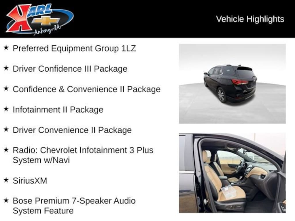 At Karl Chevrolet we want to help you find the best new or used car in Ankeny that suits your needs. When you buy a new car at Karl Chevrolet you know you're finding a vehicle you can rely on. We have a great selection of Platinum Quality Pre-Owned Vehicles. We also pride ourselves in creating a friendly atmosphere and a reliable Dealership that you can trust. Call us and our experts will be glad to help you! (515) 299-4300. *Equipment and options are generated by a 3rd party vendor, exact vehicle options may vary. Please see a salesperson for complete details and vehicle information.