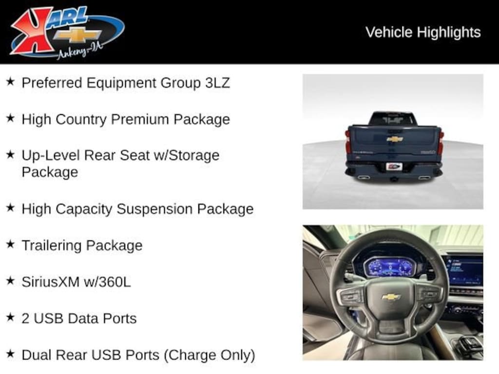 At Karl Chevrolet we want to help you find the best new or used car in Ankeny that suits your needs. When you buy a new car at Karl Chevrolet you know you're finding a vehicle you can rely on. We have a great selection of Platinum Quality Pre-Owned Vehicles. We also pride ourselves in creating a friendly atmosphere and a reliable Dealership that you can trust. Call us and our experts will be glad to help you! (515) 299-4300. *Equipment and options are generated by a 3rd party vendor, exact vehicle options may vary. Please see a salesperson for complete details and vehicle information.
