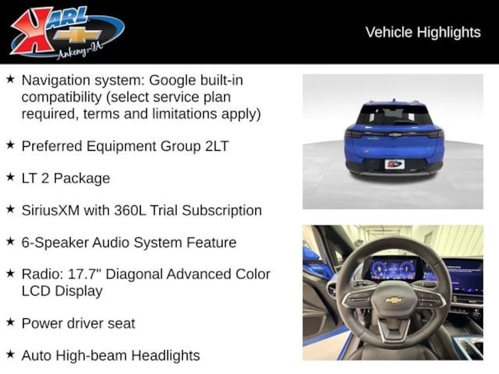 Certification Program Details: Karl Chevrolet of Ankeny, The Nation's #1 CarBravo Certified Dealer! Every CarBravo Certified vehicle includes: Comprehensive 126-Point Inspection Professionally inspected by factory-trained technicians to meet strict mechanical, safety, and cosmetic standards. 12-Month / 12,000-Mile Bumper-to-Bumper Limited Warranty Enjoy added peace of mind with extensive coverage from the day you drive off the lot. 24/7 Roadside Assistance & Courtesy Transportation Flat tire? Dead battery? Need a tow? You're covered anywhere, anytime throughout the warranty period. Vehicle History & Title Guarantee Clean title, completed safety recalls, and a full CARFAX® or AutoCheck® report provided for complete transparency. 10-Day / 500-Mile Exchange Promise If you don't absolutely love it, bring it back and exchange it no hassle, no stress. Experience peace of mind and premium protection exclusively from Karl Chevrolet of Ankeny, the Nation's #1 CarBravo Dealer!- Navigation system: Google built-in compatibility (select service plan required, terms and limitations apply)- 6-Speaker Audio System Feature- Radio: 17.7 Diagonal Advanced Color LCD Display- SiriusXM with 360L Trial Subscription- Power driver seat- Auto High-beam Headlights- Heated steering wheel- Heated Driver and Front Passenger Seats Cushion and Seatback- LT 2 Package- Preferred Equipment Group 2LTThis 2025 Chevrolet Equinox EV LT is a remarkable electric vehicle that combines style, technology, and uncompromising performance. With its sleek blue exterior and a host of premium features, this Equinox EV is sure to turn heads wherever you go.Under the hood, you'll find an efficient electric motor that delivers a smooth and responsive driving experience. The instant torque and instant acceleration of the electric powertrain will make every drive a thrill. And with the impressive range, you can enjoy the freedom of electric driving without worrying about running out of power.Step inside, and you'll be greeted by a spacious and well-appointed cabin. The Equinox EV LT is packed with cutting-edge technology, including a large 17.7-inch touchscreen display, seamless Google built-in compatibility, and a premium 6-speaker audio system. The heated steering wheel and heated front seats will keep you comfortable in any weather, while the power driver's seat and adjustable lumbar support ensure a perfect driving position.Safety is also a top priority in the Equinox EV, with features like automatic high-beam headlights, OnStar and Chevrolet connected services, and a suite of advanced airbags. You can drive with confidence, knowing that you and your passengers are well-protected.This Equinox EV is a true standout in the electric vehicle market, offering a winning combination of style, technology, and performance. Visit Karl Chevrolet of Ankeny today to experience it for yourself and discover why it's the perfect choice for your next electric vehicle.At Karl Chevrolet we want to help you find the best new or used car in Ankeny that suits your needs. When you buy a new car at Karl Chevrolet you know you're finding a vehicle you can rely on. We have a great selection of Platinum Quality Pre-Owned Vehicles. We also pride ourselves in creating a friendly atmosphere and a reliable Dealership that you can trust. Call us and our experts will be glad to help you! (515) 299-4300. *Equipment and options are generated by a 3rd party vendor, exact vehicle options may vary. Please see a salesperson for complete details and vehicle information.