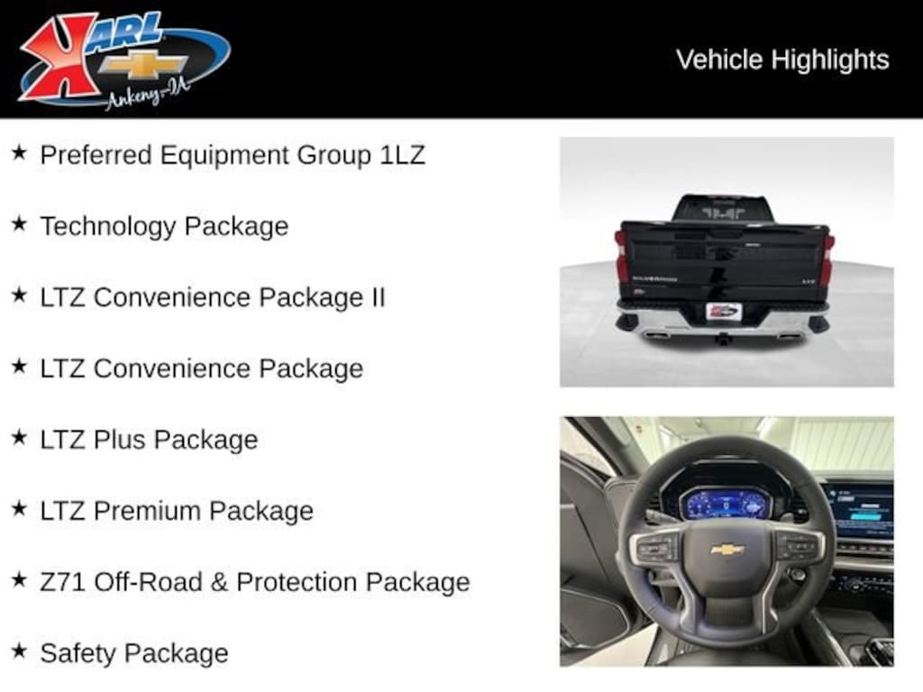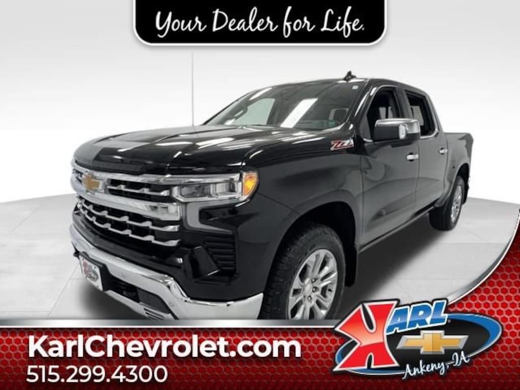 Recent Arrival! CARFAX One-Owner, Local Trade, Sold New at Karls & All Services Done at Karls! Equipped With Mud Flaps! Clean CARFAX. Certified. Black 2025 Chevrolet Silverado 1500 LTZ 4WD CREW CAB 147 LT EcoTec3 5.3L V8 10-Speed Automatic, 4WD, Jet Black Leather, 10-Way Power Driver Seat w/Lumbar, 10-Way Power Passenger Seat Adjuster w/Lumbar, 12.3 Multicolor Reconfigurable Digital Display, 15 Diagonal Multicolor Head-Up Display, 2 USB Data Ports, 2nd Row Heated Outboard Seats, Adaptive Cruise Control, All-Weather Floor Liner (LPO) (AAK), Apple CarPlay/Android Auto, Auto High-beam Headlights, Auto-Dimming Inside Rear-View Mirror, Auto-Locking Rear Differential, Bed View Camera, Bluetooth® For Phone, Chevytec Spray-On Black Bedliner, Chrome Mirror Caps, Color-Keyed Carpeting Floor Covering, Deep-Tinted Glass, Driver Memory, Dual Exhaust w/Black Exhaust Tips, Dual Rear USB Ports (Charge Only), Electric Rear-Window Defogger, Electronic Cruise Control, Floor Mounted Center Console, Forward Collision Alert, Front dual zone A/C, Front Frame-Mounted Black Recovery Hooks, Front LED Fog Lamps, Front Rain-Sensing Wipers, Front Rubberized Vinyl Floor Mats, HD Surround Vision, Heated Driver & Front Outboard Passenger Seats, Heated Steering Wheel, Heavy-Duty Air Filter, High Capacity Suspension Package, Hill Descent Control, Hitch Guidance w/Hitch View, In-Vehicle Trailering System App, Integrated Trailer Brake Controller, Keyless Open & Start, Lane Keep Assist w/Lane Departure Warning, LED Cargo Area Lighting, LTZ Convenience Package, Off-Road Suspension, OnStar Services Capable, Outside Heated Power-Adjustable Mirrors, Perimeter Lighting, Power Front Passenger Windows w/Express Up/Down, Power Front Windows w/Driver Express Up/Down, Power Rear Windows w/Express Down, Power Sliding Rear Window w/Rear Defogger, Power Sunroof, Power Tailgate, Power Tilt & Telescoping Steering Column, Preferred Equipment Group 1LZ, Premium Bose 7-Speaker Sound System, Rear Camera Mirror, Rear Cross Traffic Braking, Rear Pedestrian Alert, Rear Rubberized-Vinyl Floor Mats, Rear Wheelhouse Liners, Remote Vehicle Starter System, Safety Alert Seat, Safety Package, SiriusXM w/360L Trial Subscription, Standard Tailgate, Steering Wheel Audio Controls, Technology Package, Teen Driver, Theft Deterrent System (Unauthorized Entry), Tire Pressure Monitoring System, Trailer Camera Provisions, Trailer Side Blind Zone Alert, Trailering Package, Ultrasonic Front & Rear Park Assist, Universal Home Remote, Up-Level Rear Seat w/Storage Package, Ventilated Driver & Front Passenger Seats, Wheels: 20 x 9 Sterling Silver Painted Aluminum, Wi-Fi Hot Spot Capable, Wireless Charging, Wrapped Steering Wheel, Z71 Off-Road & Protection Package, Z71 Off-Road Package. 16/19 City/Highway MPG 10-Speed Automatic 4WD