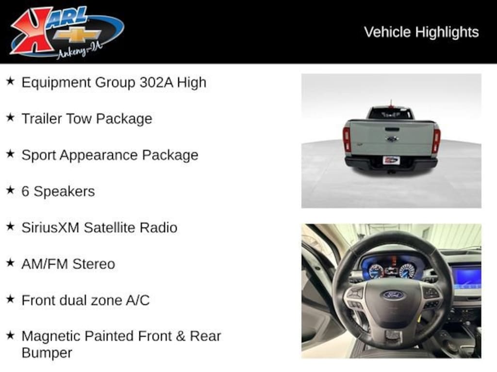 At Karl Chevrolet we want to help you find the best new or used car in Ankeny that suits your needs. Check out the 2023 Ford Ranger For Sale in Ankeny, IA. When you buy a new car at Karl Chevrolet you know you're finding a vehicle you can rely on. We have a great selection of Platinum Quality Pre-Owned Vehicles. We also pride ourselves in creating a friendly atmosphere and reliable new car dealership that you can trust. Call us with any questions about our 2023 Ford Ranger and our experts will be glad to help you! (515) 299-4300. *Equipment and options are generated by a 3rd party vendor, exact vehicle options may vary. Please see a salesperson for complete details and vehicle information.