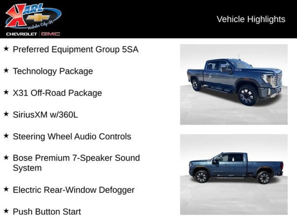 At Karl Chevrolet/GMC we want to help you find the best new or used car in Webster City that suits your needs. When you buy a new car at Karl Chevrolet/GMC you know you're finding a vehicle you can rely on. We have a great selection of CarBravo Quality Pre-Owned Vehicles. We also pride ourselves in creating a friendly atmosphere and a reliable Dealership that you can trust. Call us and our experts will be glad to help you! (515) 209-7117. *Equipment and options are generated by a 3rd party vendor, exact vehicle options may vary. Please see a salesperson for complete details and vehicle information.
