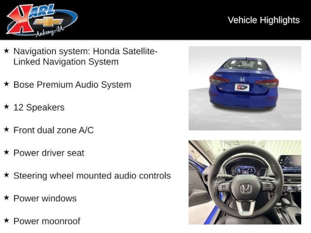 At Karl Chevrolet we want to help you find the best new or used car in Ankeny that suits your needs. Check out the 2024 Honda Civic For Sale in Ankeny, IA. When you buy a new car at Karl Chevrolet you know you're finding a vehicle you can rely on. We have a great selection of Platinum Quality Pre-Owned Vehicles. We also pride ourselves in creating a friendly atmosphere and reliable new car dealership that you can trust. Call us with any questions about our 2024 Honda Civic and our experts will be glad to help you! (515) 299-4300. *Equipment and options are generated by a 3rd party vendor, exact vehicle options may vary. Please see a salesperson for complete details and vehicle information.