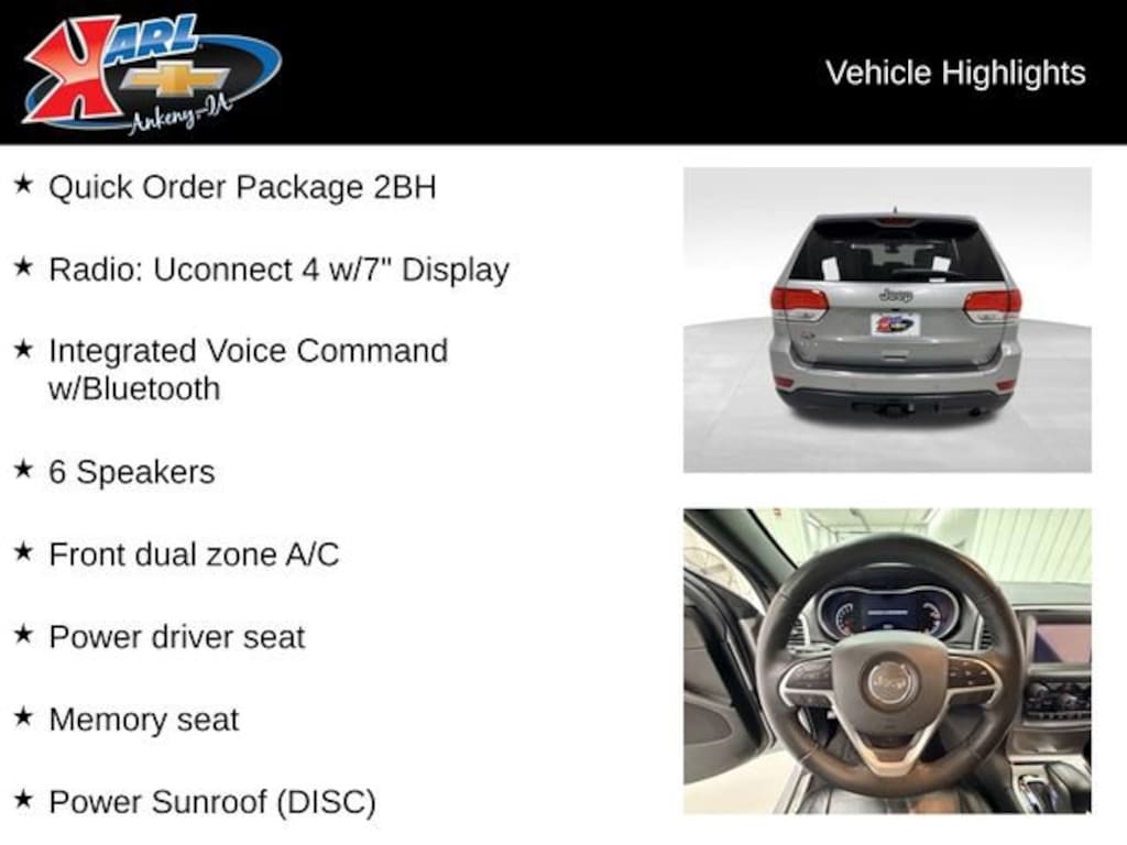 At Karl Chevrolet we want to help you find the best new or used car in Ankeny that suits your needs. Check out the 2018 Jeep Grand Cherokee For Sale in Ankeny, IA. When you buy a new car at Karl Chevrolet you know you're finding a vehicle you can rely on. We have a great selection of Platinum Quality Pre-Owned Vehicles. We also pride ourselves in creating a friendly atmosphere and reliable new car dealership that you can trust. Call us with any questions about our 2018 Jeep Grand Cherokee and our experts will be glad to help you! (515) 299-4300. *Equipment and options are generated by a 3rd party vendor, exact vehicle options may vary. Please see a salesperson for complete details and vehicle information.