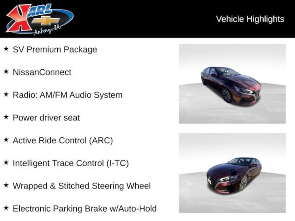 This 2024 Nissan Altima 2.5 SV 2.5 SV AWD SEDAN is a true standout in its class, offering a compelling blend of style, performance, and technology. Experience the difference for yourself by scheduling a test drive today at Karl Chevrolet of Ankeny.